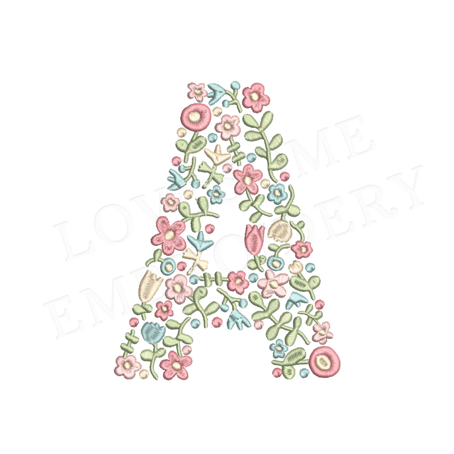 This listing features a machine embroidery file of one uppercase letter "A" which has a beautiful dainty floral fill design with pastel spring colors in 4inch size.