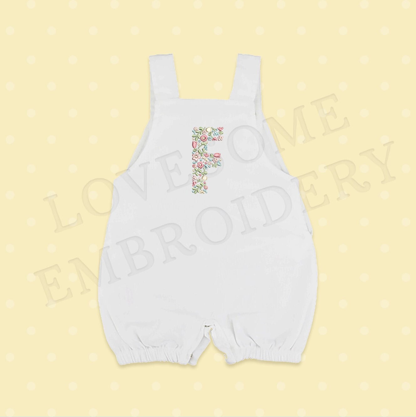 This listing features a machine embroidery file of one uppercase letter "F" which has a beautiful dainty floral fill design with pastel spring colors in 4inch size.
