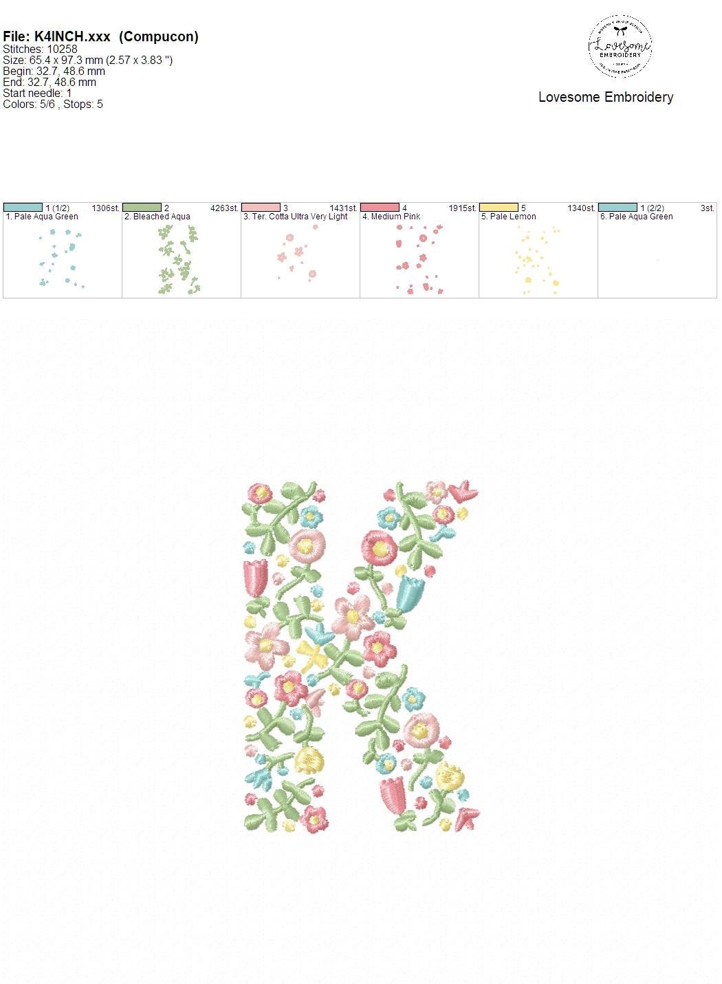 NEW Floral Letter K 4inch Machine Embroidery Design Dainty Flowers Letters in Spring Colors Digital Download | Lovesome Design