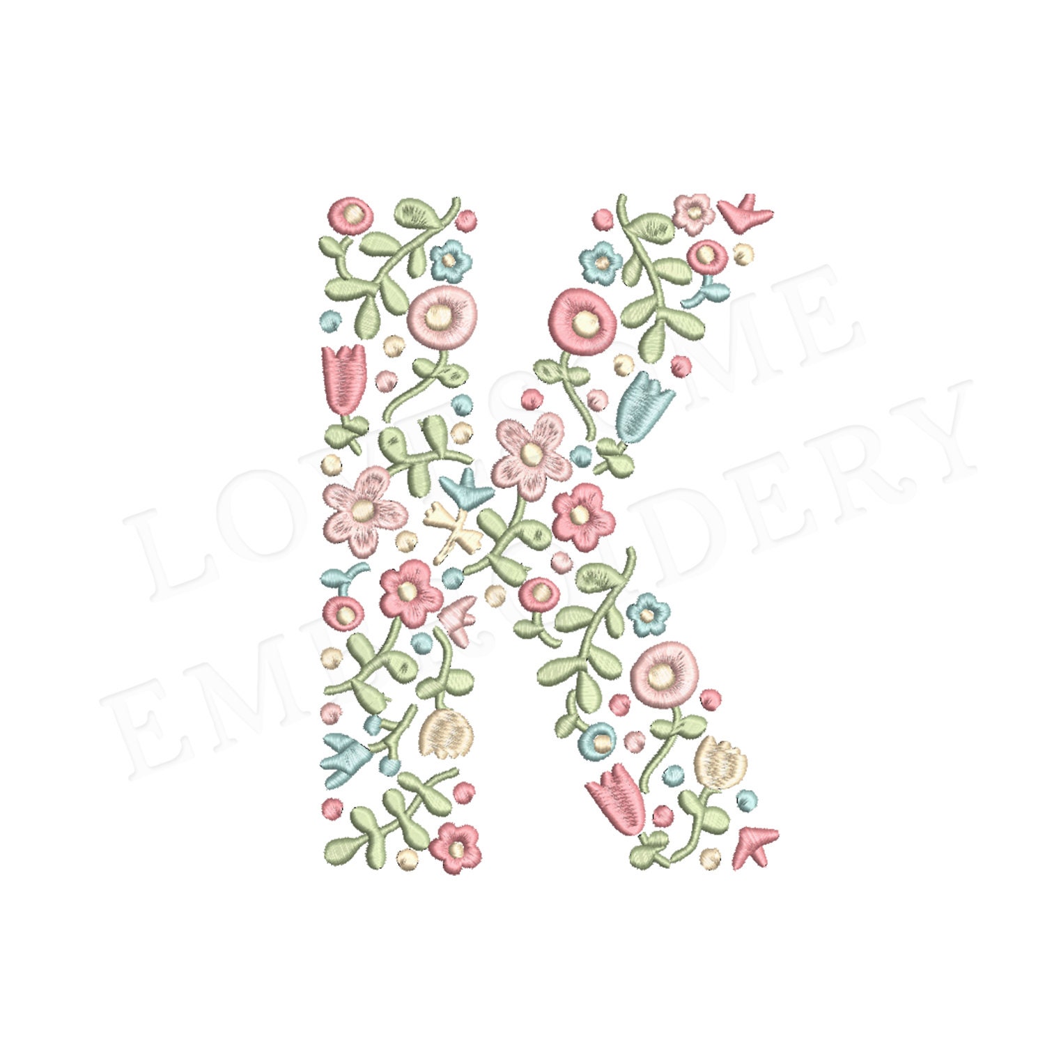 This listing features a machine embroidery file of one uppercase letter "K" which has a beautiful dainty floral fill design with pastel spring colors in 4inch size.