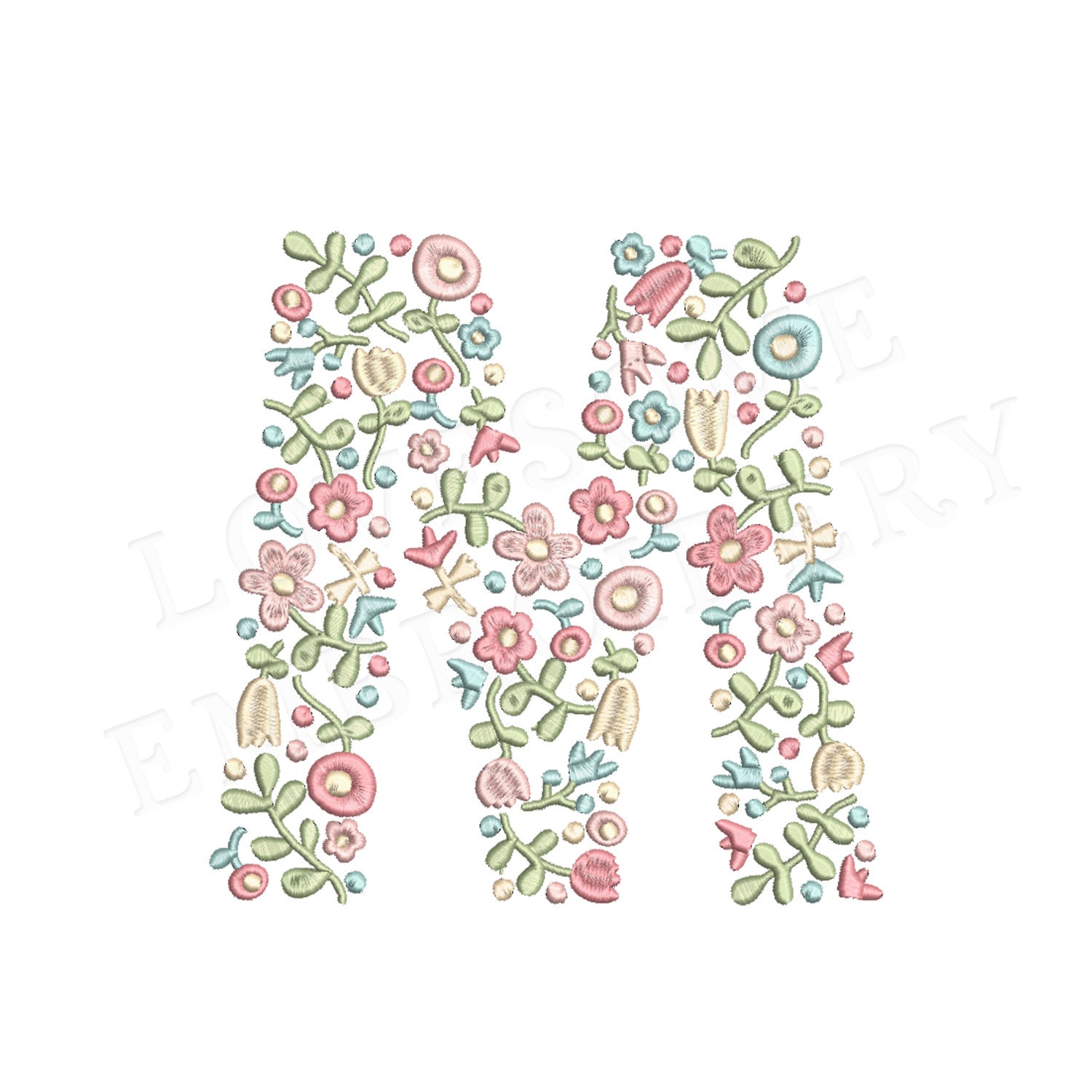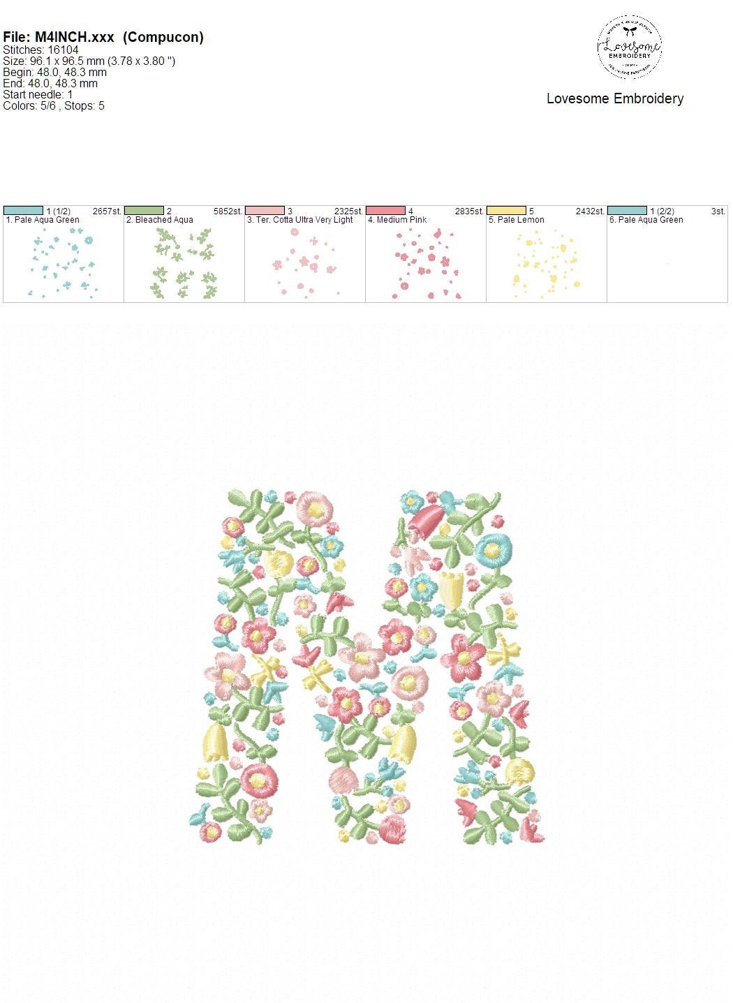 NEW Floral Letter M 4inch Machine Embroidery Design Dainty Flowers Letters in Spring Colors Digital Download | Lovesome Design