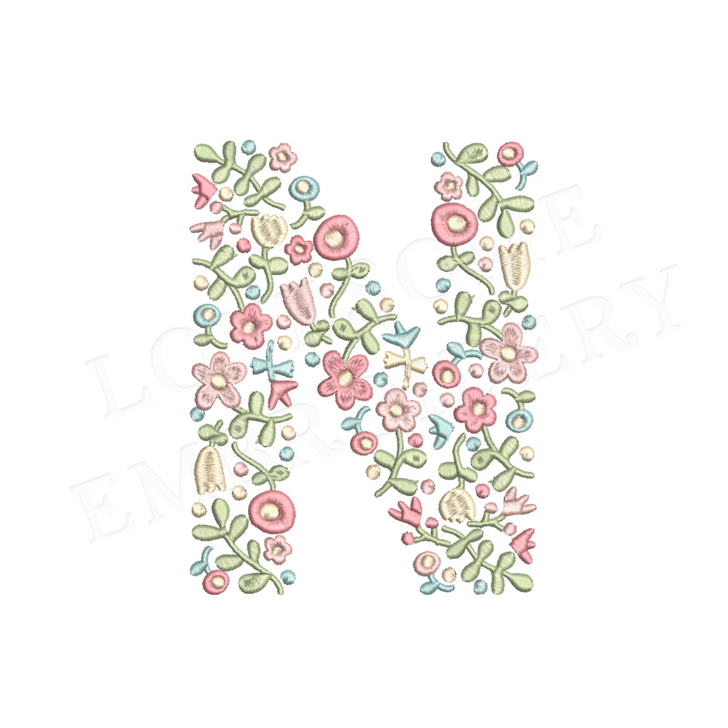 This listing features a machine embroidery file of one uppercase letter "N" which has a beautiful dainty floral fill design with pastel spring colors in 4inch size.