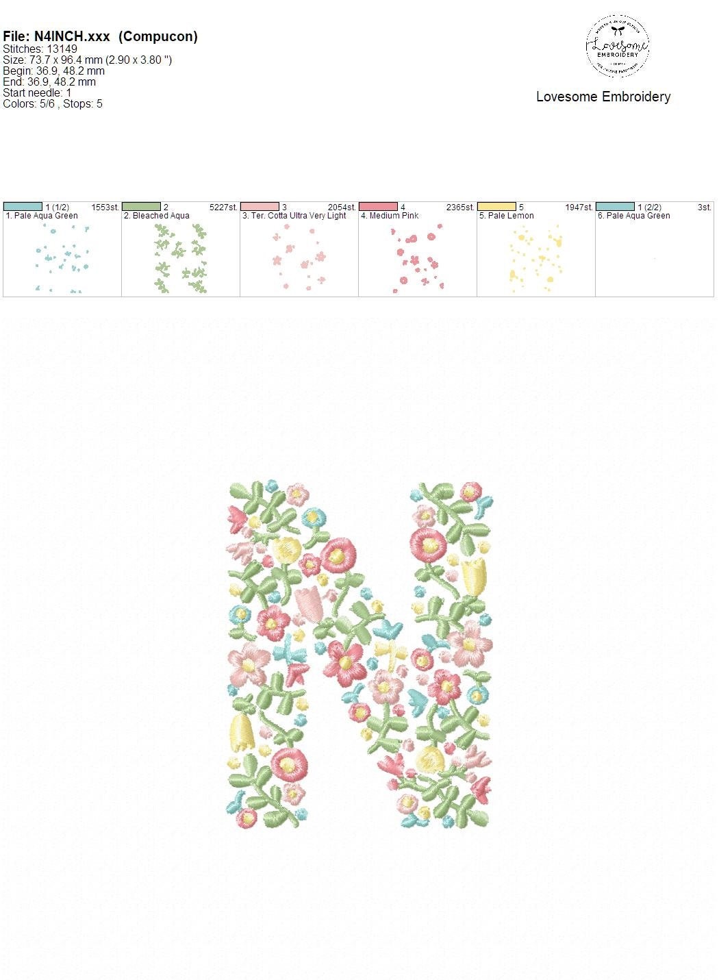 NEW Floral Letter N 4inch Machine Embroidery Design Dainty Flowers Letters in Spring Colors Digital Download | Lovesome Design