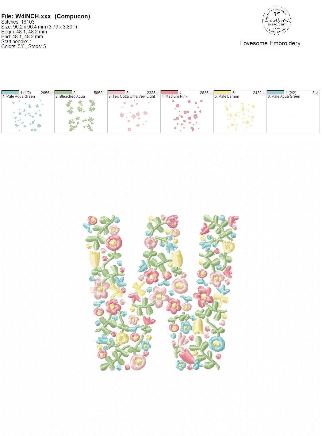 NEW Floral Letter W 4inch Machine Embroidery Design Dainty Flowers Letters in Spring Colors Digital Download | Lovesome Design