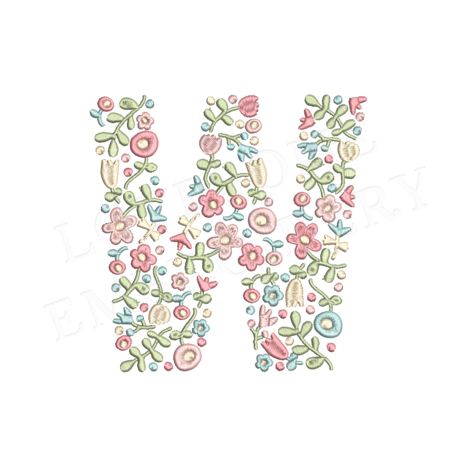 This listing features a machine embroidery file of one uppercase letter "W" which has a beautiful dainty floral fill design with pastel spring colors in 4inch size.