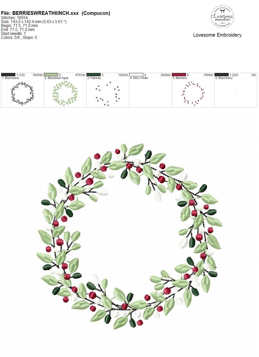 This listing features a machine embroidery file of berry wreath design in 6 inch size.