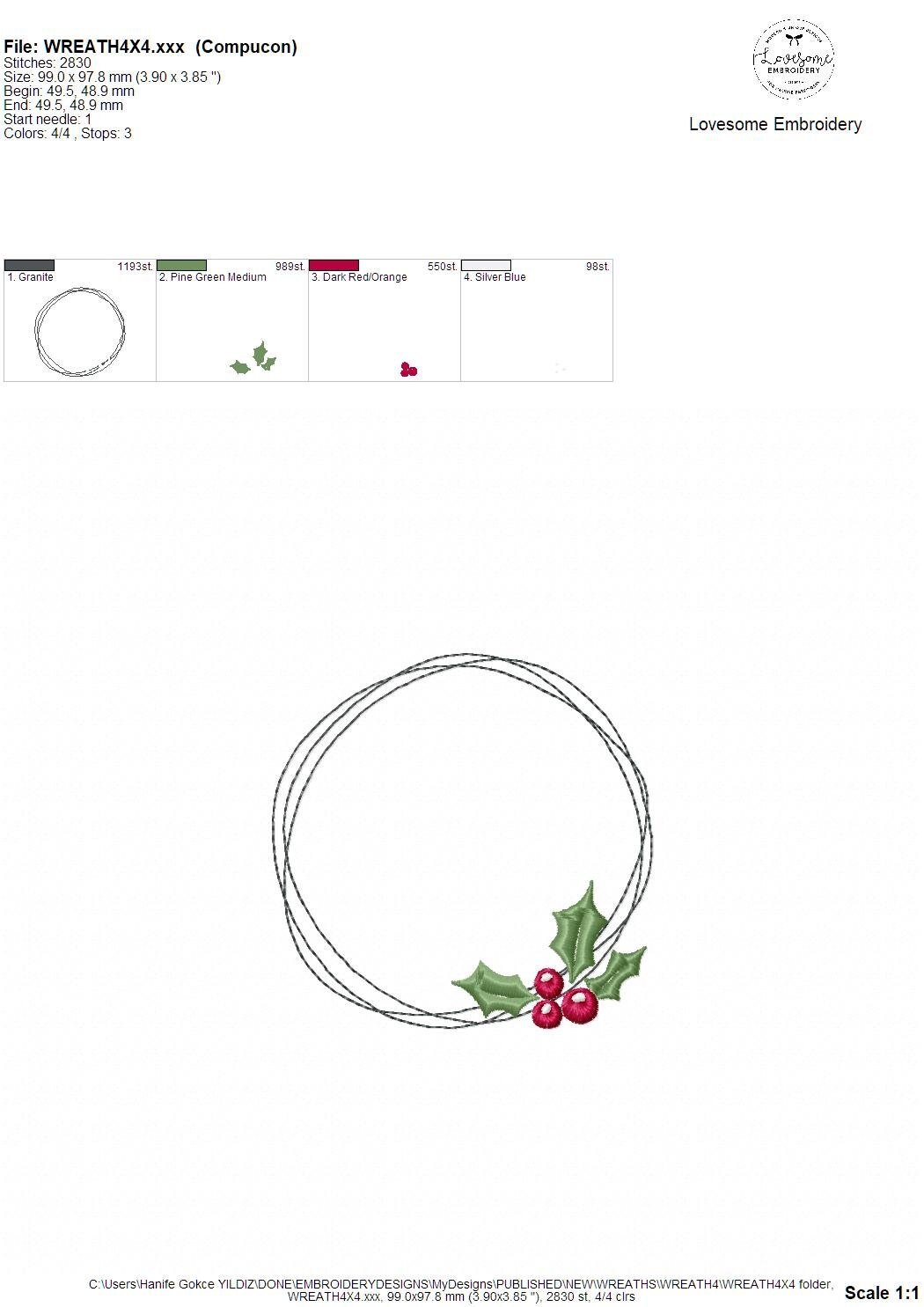 This listing features a machine embroidery file of berry wreath design in 4 inch size.