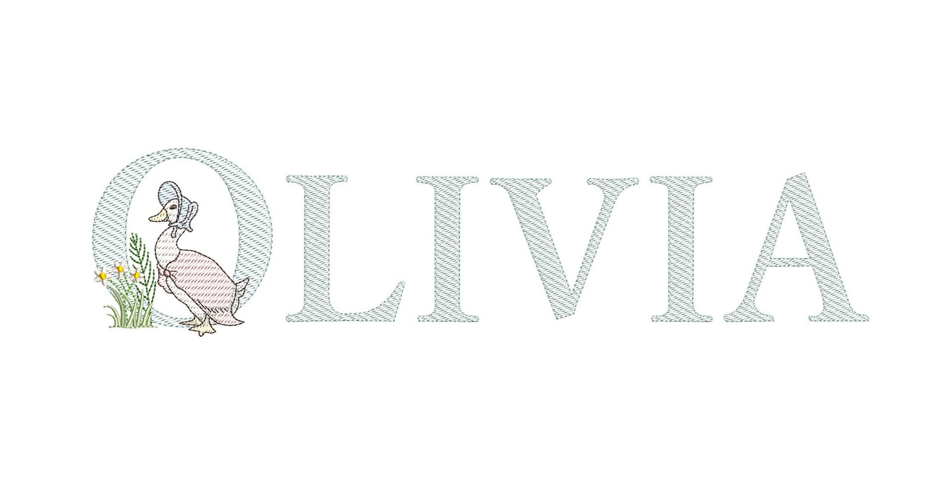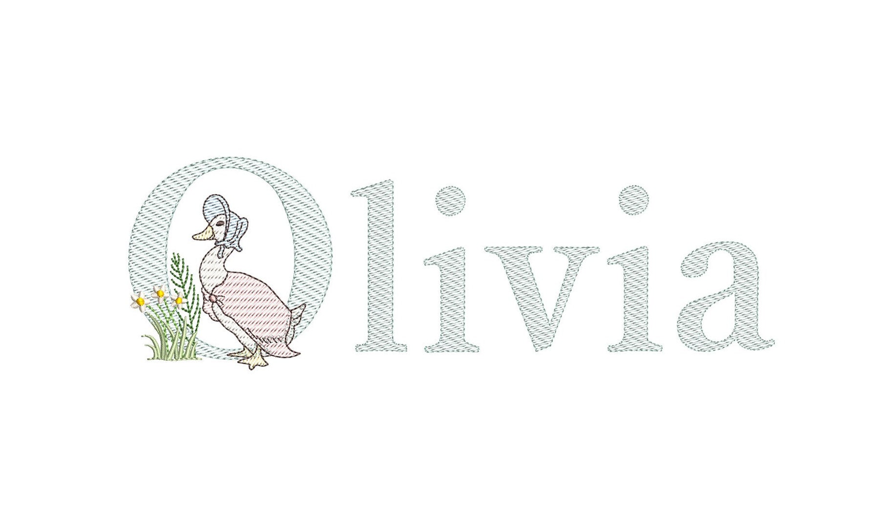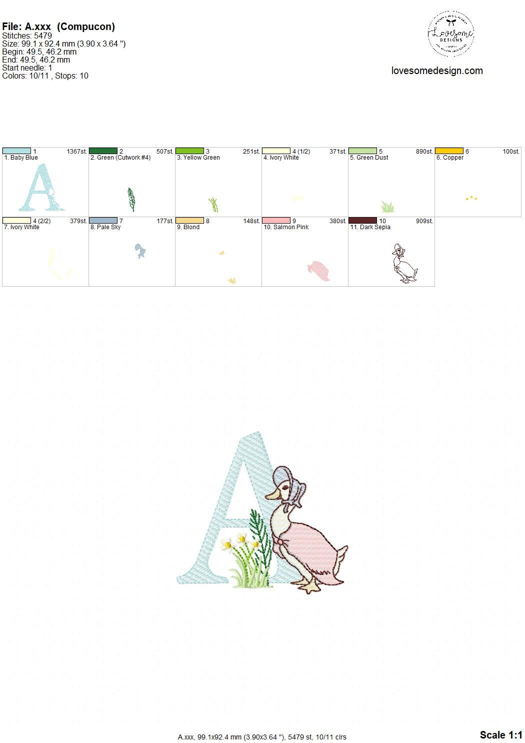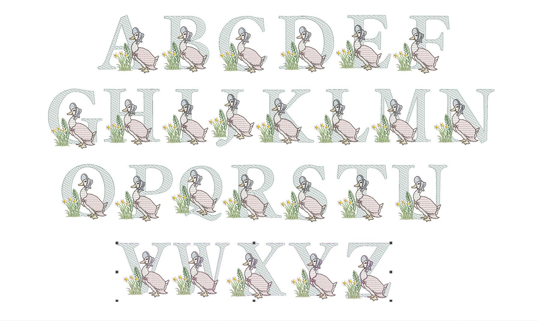 This listing features a machine embroidery font set which includes embroidery files of 26 uppercase monogram letters with quick stitch (light fill or sketch fill) Jemima Puddleduck design in 4inch size. (For the whole set, pls see the listing images.)