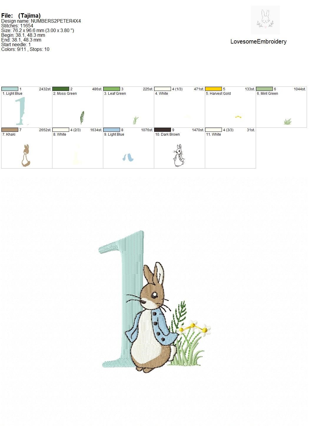 This listing features a machine embroidery numbers set which includes embroidery files of ten numbers (0-9) with Peter Rabbit design in one size for 4x4 hoops for machine embroidery. (For the whole set, pls see the listing images.)