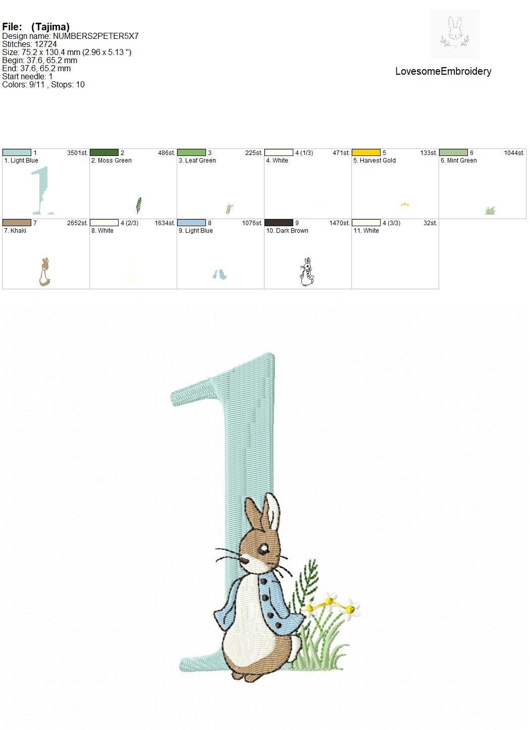 This listing features a machine embroidery numbers set which includes embroidery files of ten numbers (0-9) with Peter Rabbit design in one size for 5x7 hoops for machine embroidery. (For the whole set, pls see the listing images.)