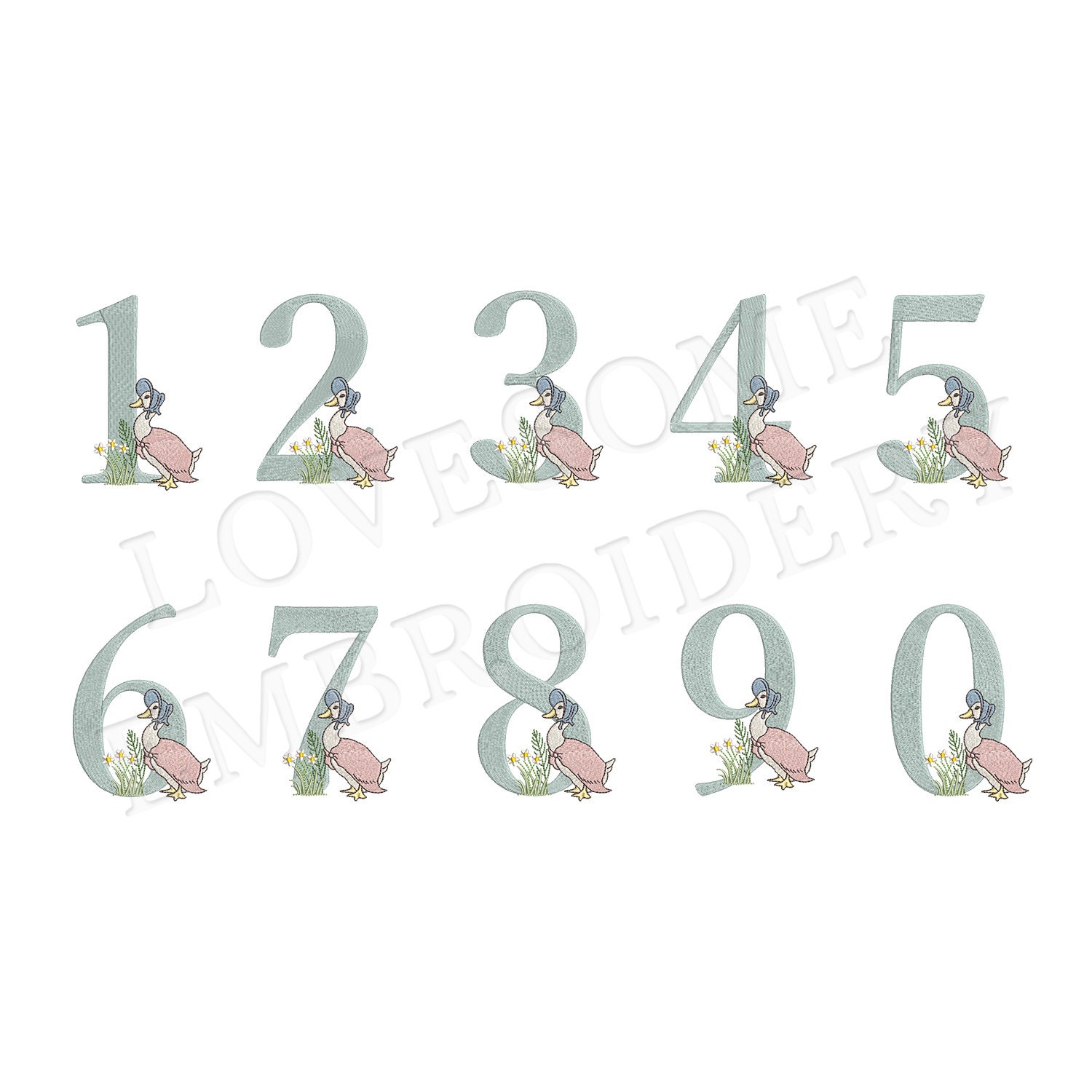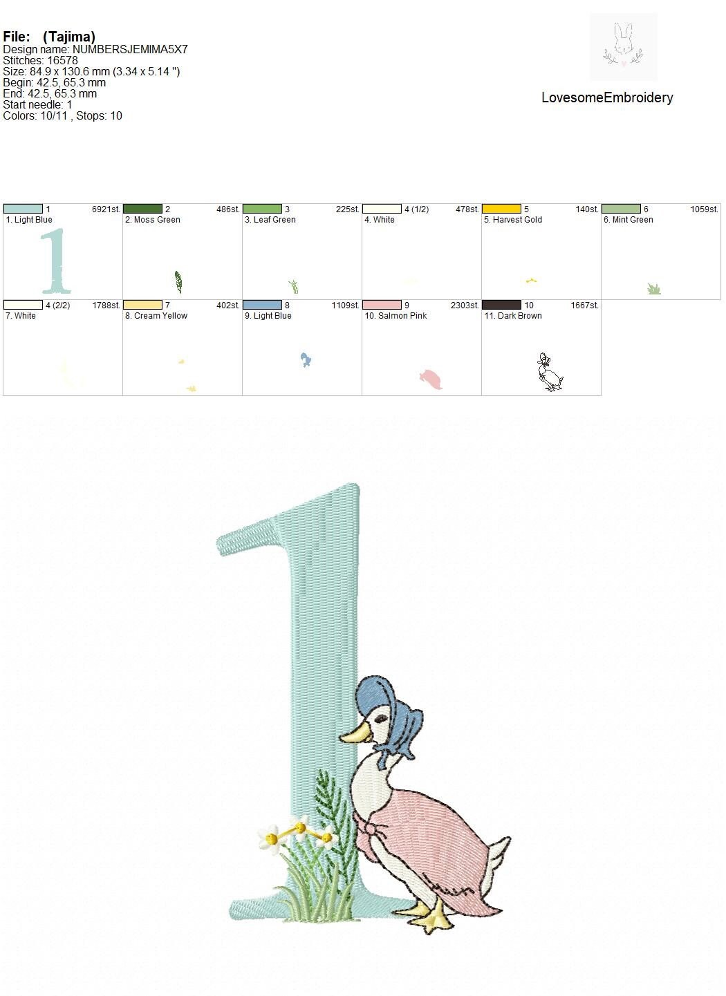 This listing features a machine embroidery numbers set which includes embroidery files of ten numbers (0-9) with Jemima Puddleduck design in one size for 5x7 hoops for machine embroidery. (For the whole set, pls see the listing images.)