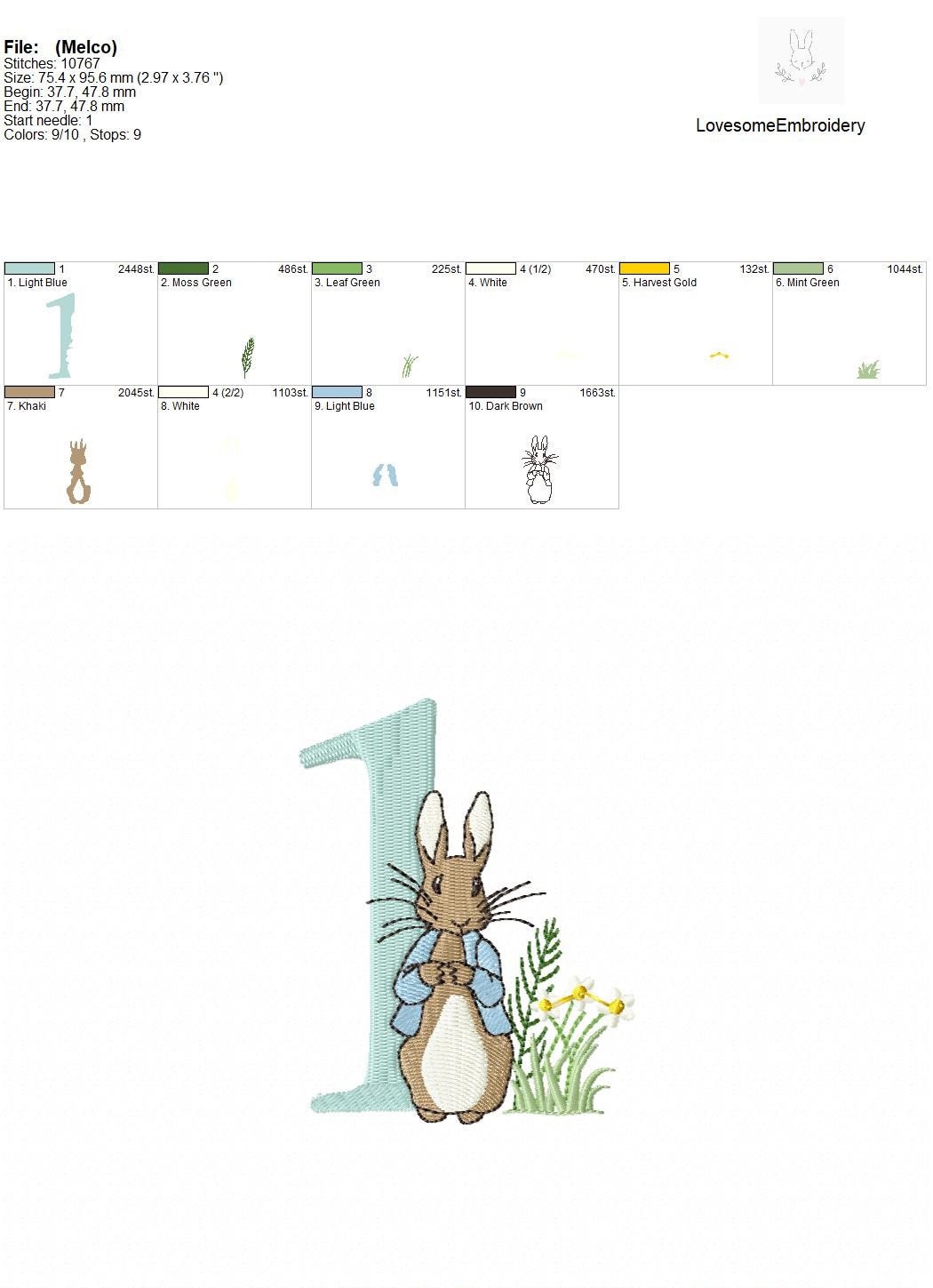 This listing includes number design set of Peter Rabbit and three letterings "Month", "Months" and "Year" in 4 inch size, can be stitched with two hoopings on 4x4 embroidery hoops. (For the whole set, pls see the listing images.)
