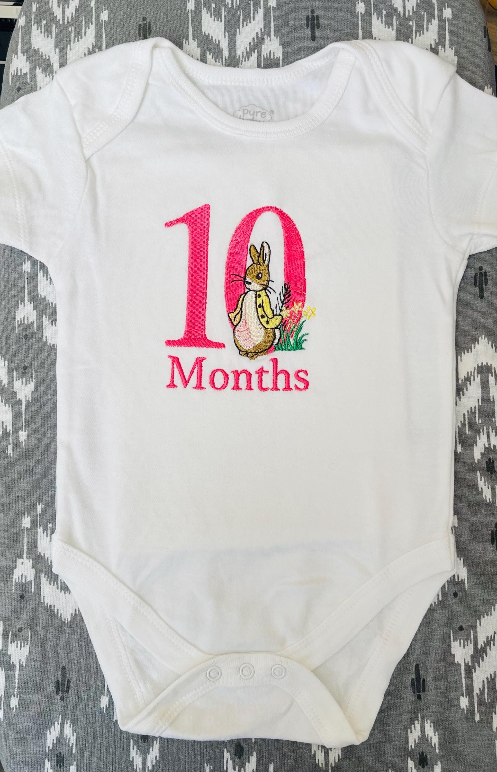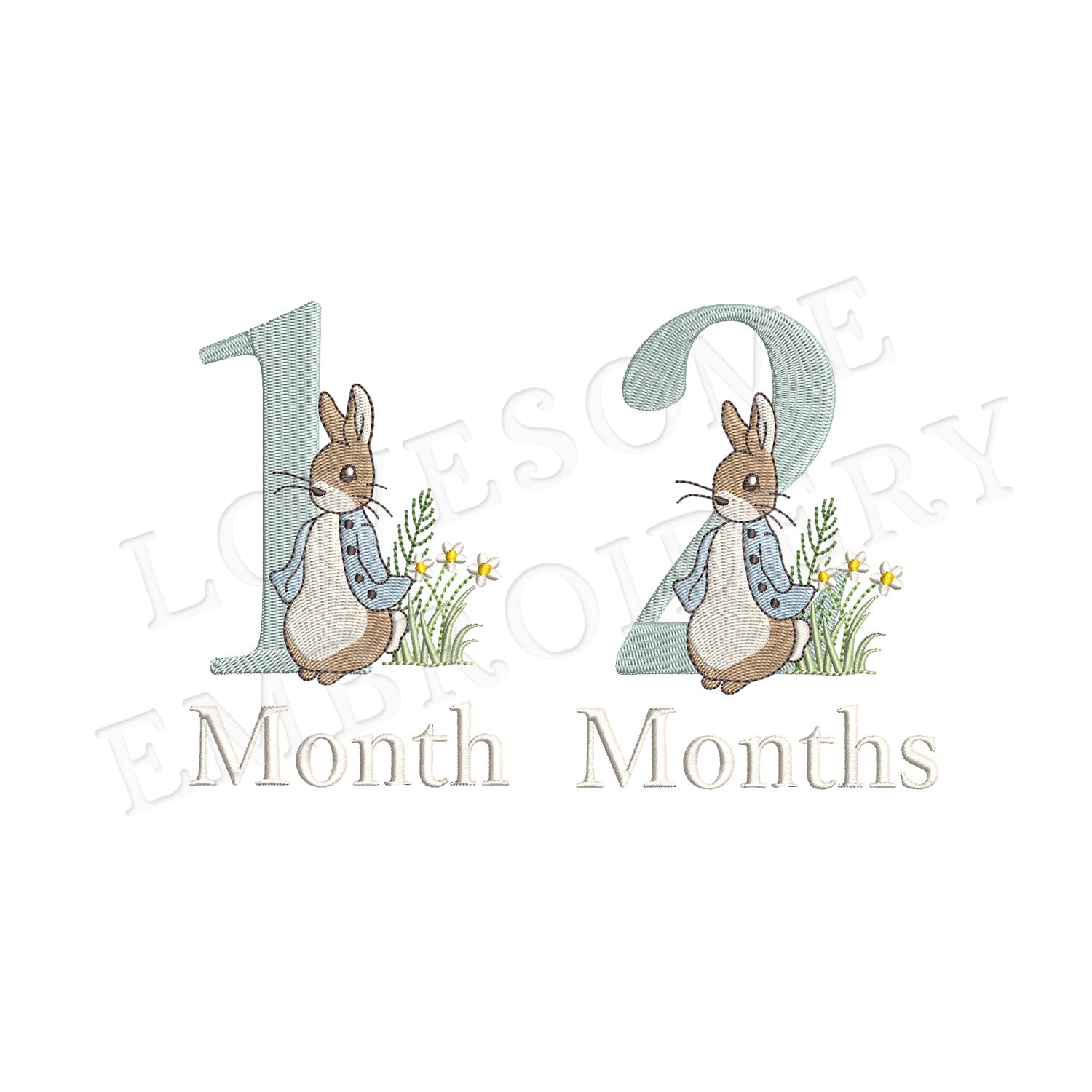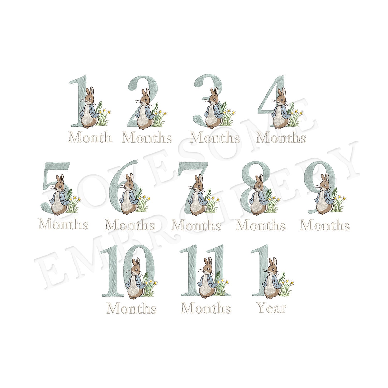This listing includes number design set of Peter Rabbit and three letterings "Month", "Months" and "Year" in 4 inch size, can be stitched with two hoopings on 4x4 embroidery hoops. (For the whole set, pls see the listing images.)