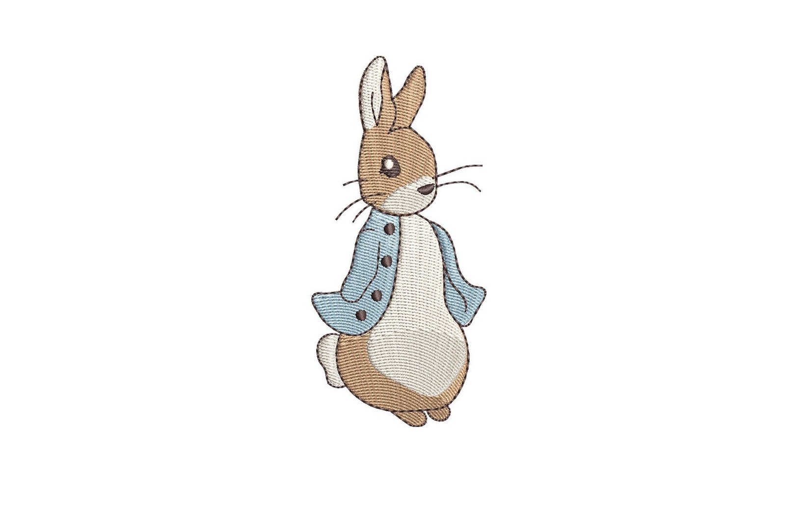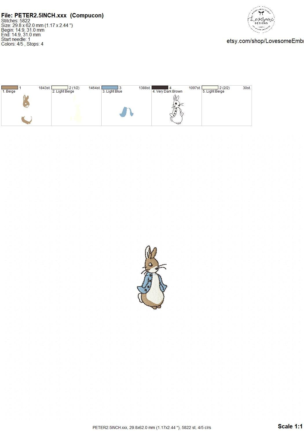 This listing features a machine embroidery file of Peter Rabbit design in 2.5 inch size.