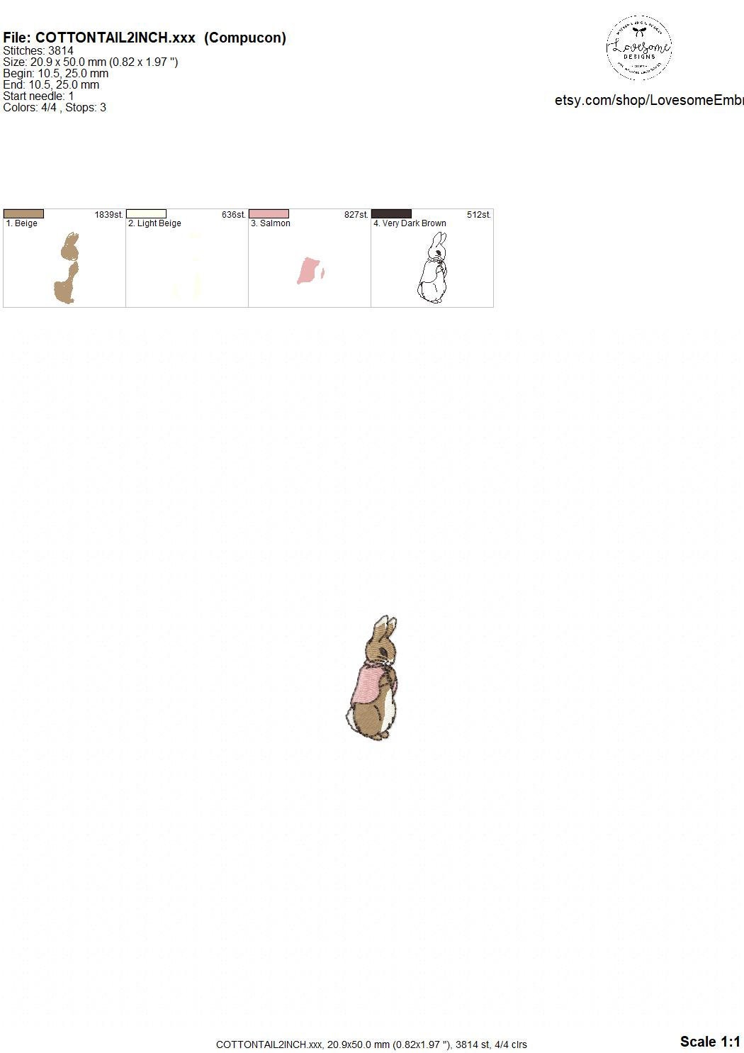 This listing features a machine embroidery file of Cottontail Rabbit design in 2 inch size.
