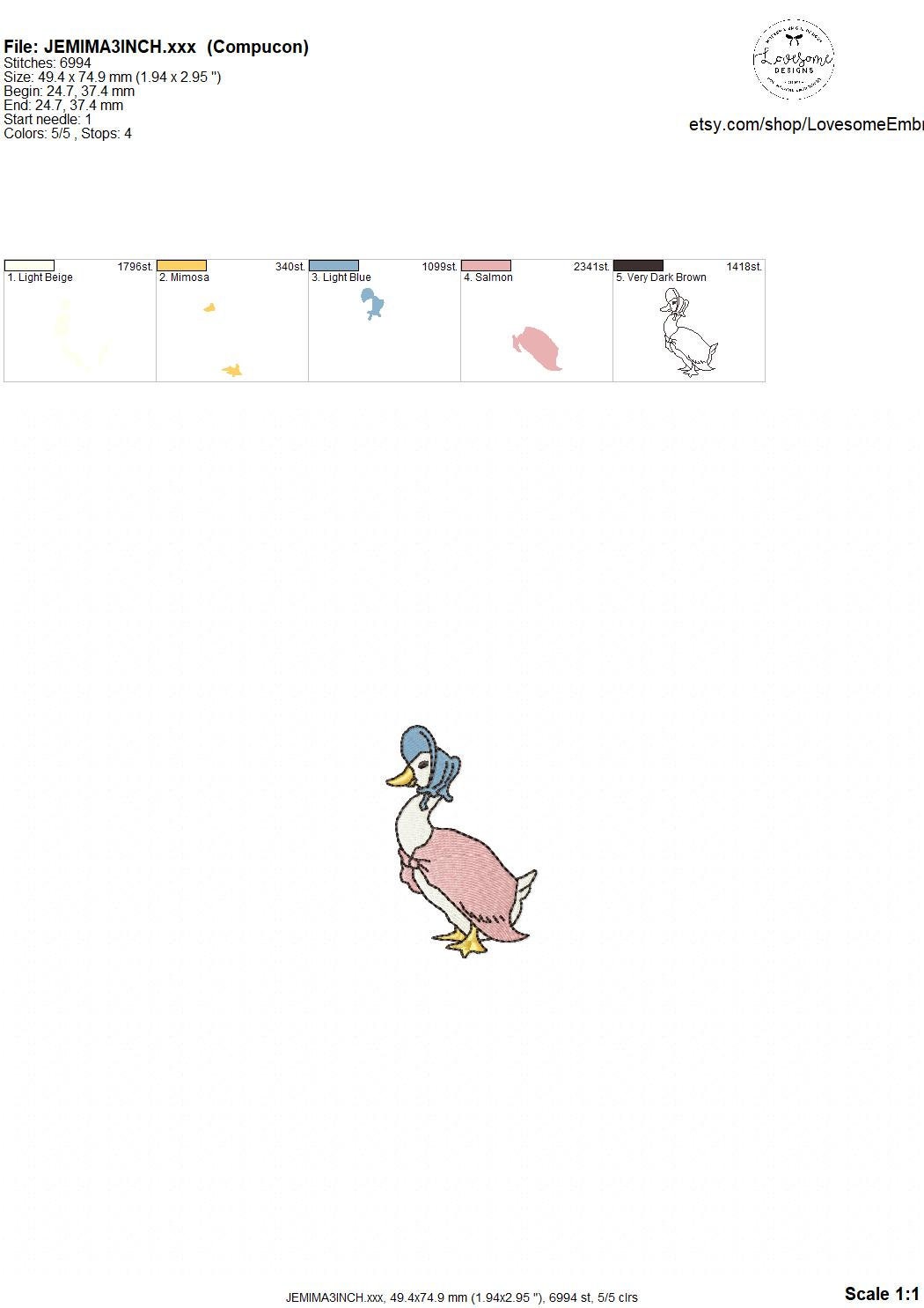 This listing features a machine embroidery file of Jemima Puddleduck design in 3 inch size.