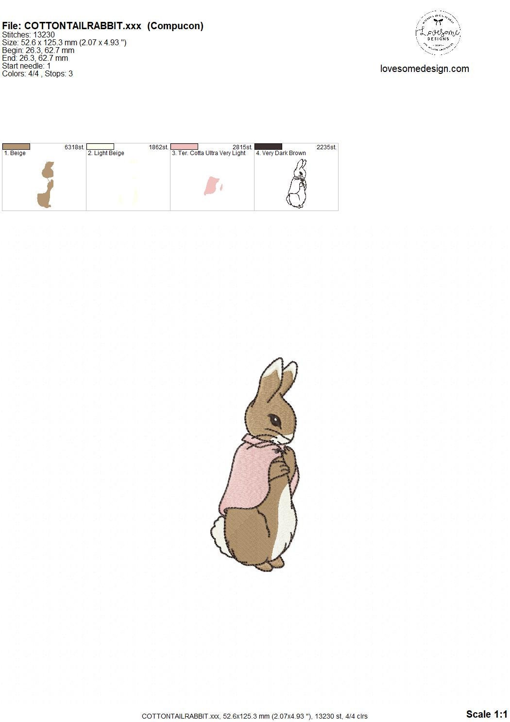 This listing features a machine embroidery file of Cottontail Rabbit design in 5 inch size.