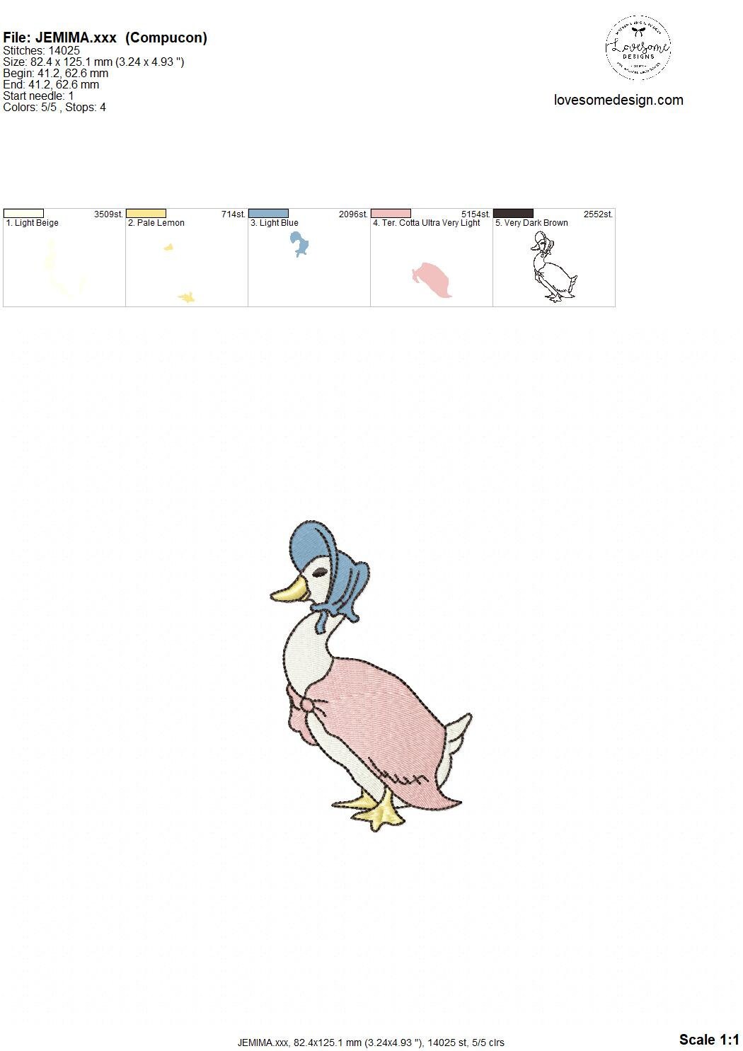 This listing features a machine embroidery file of Jemima Puddleduck design in 5 inch size.