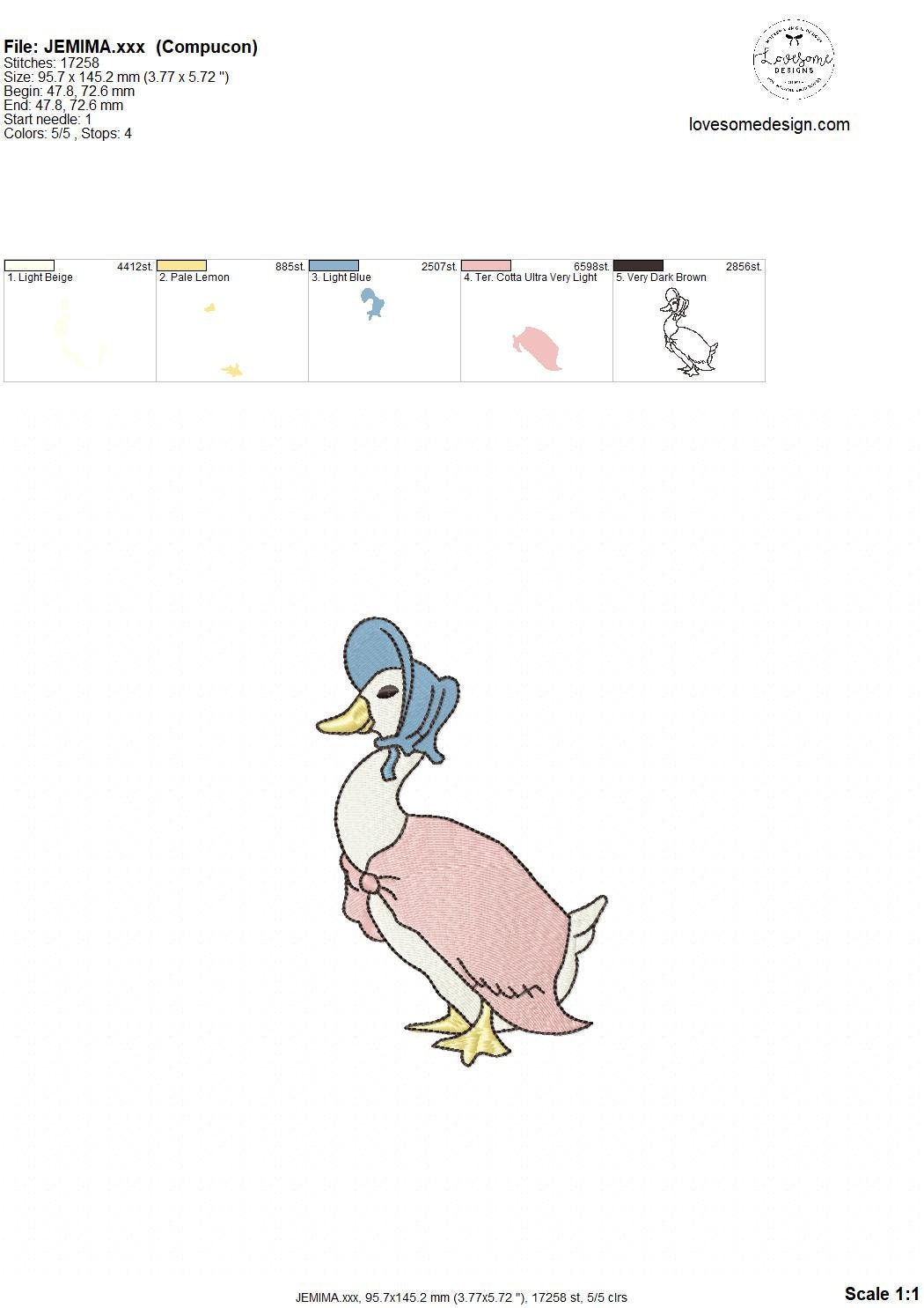 This listing features a machine embroidery file of Jemima Puddleduck design in 6 inch size.