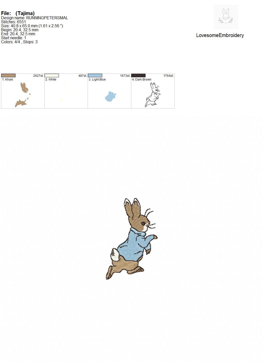 This listing features a machine embroidery file of Peter Rabbit design in 2.5 inch size.