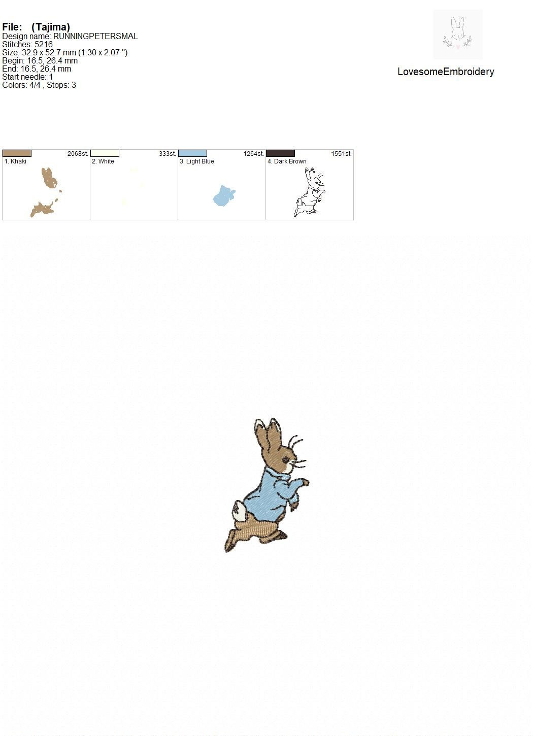 This listing features a machine embroidery file of Peter Rabbit design in 2 inch size.