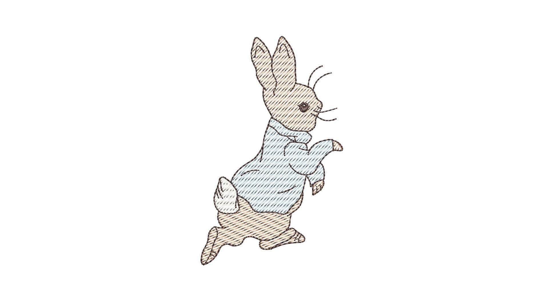 This listing features a machine embroidery file of a quick stitch (aka sketch fill or light fill) Peter Rabbit design in 4 inch size.
