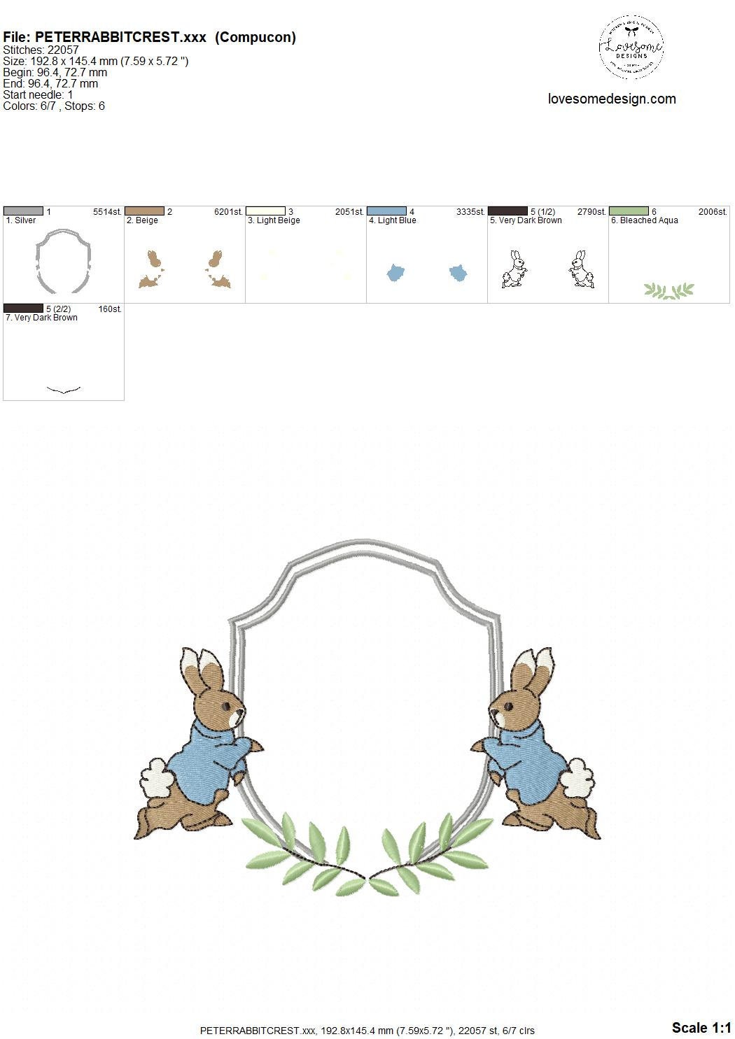 This listing features a machine embroidery file of Peter Rabbit crest design in 10 inch size.