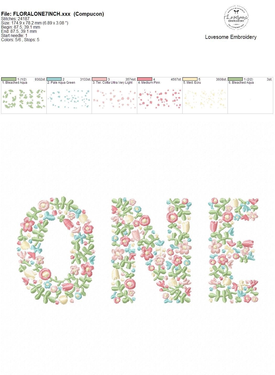 This listing features a machine embroidery file of word "ONE" which has a beautiful dainty floral fill design with pastel spring colors in 7inch size.