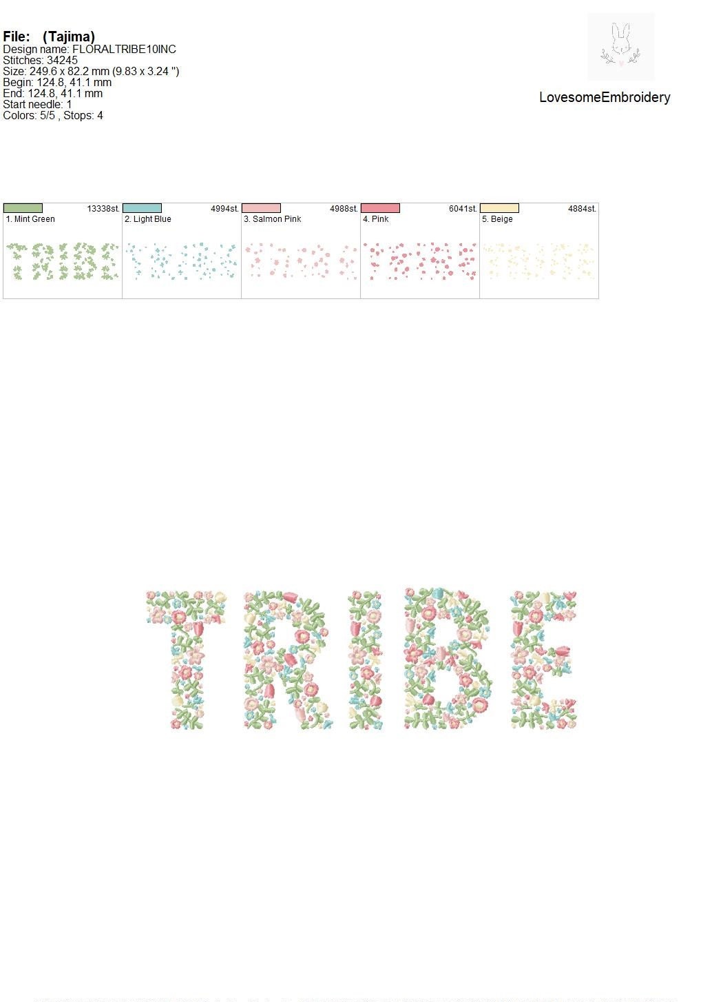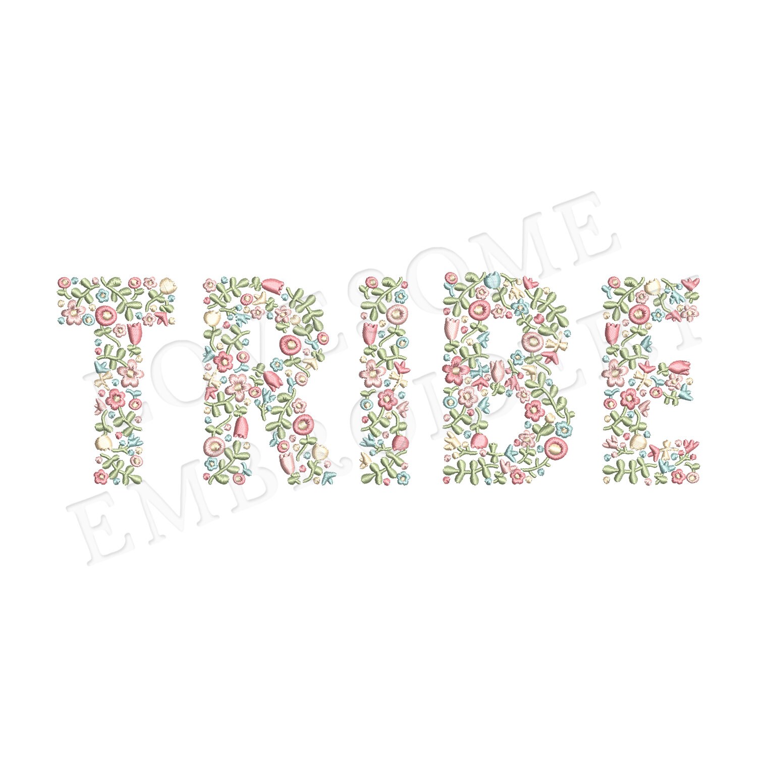 This listing features a machine embroidery file of word "TRIBE" which has a beautiful dainty floral fill design with pastel spring colors in 10inch size.