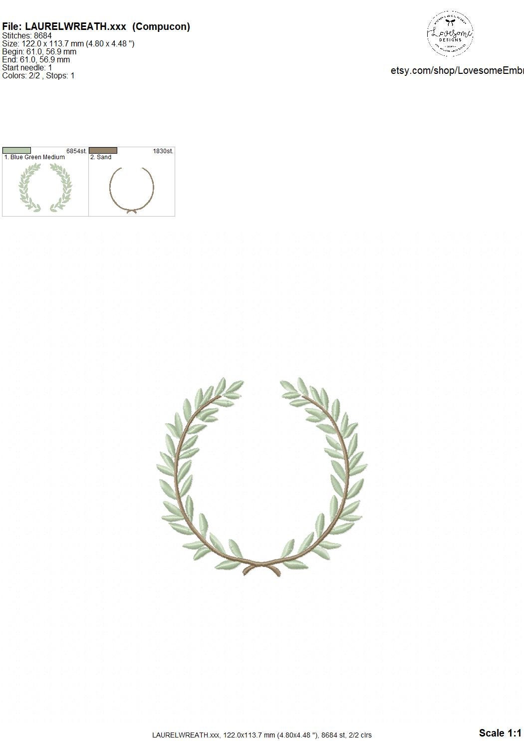This listing features a machine embroidery file of laurel wreath design in 5 inch size.