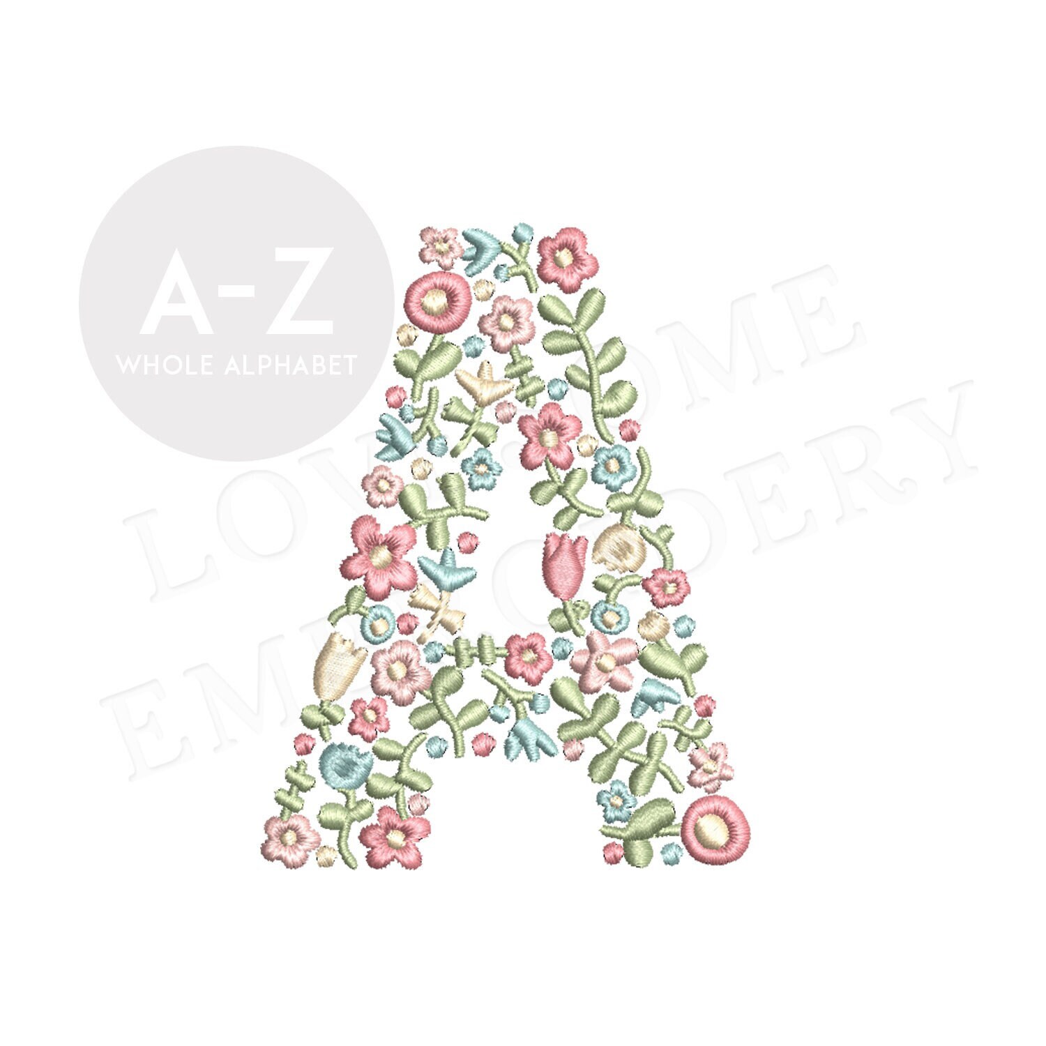 This listing features a machine embroidery font set which includes embroidery files of 26 uppercase dainty floral fill letters with pastel spring colors in 3.5inch size. For the whole set, pls see the listing images.