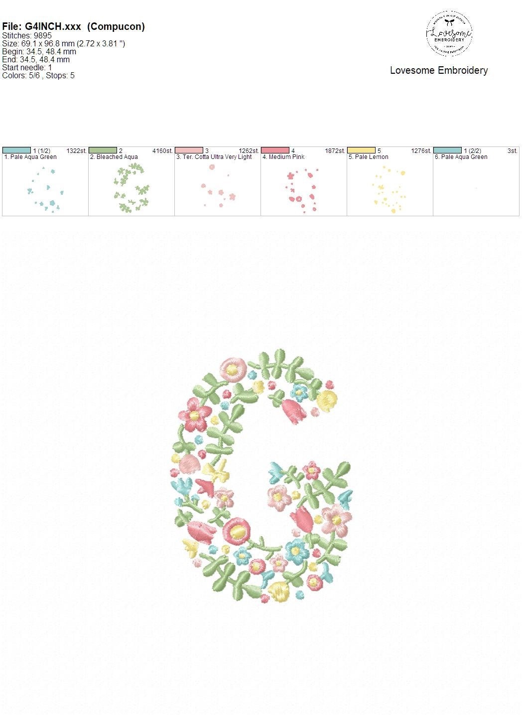 NEW Floral Letter G 4inch Machine Embroidery Design Dainty Flowers Letters in Spring Colors Digital Download | Lovesome Design