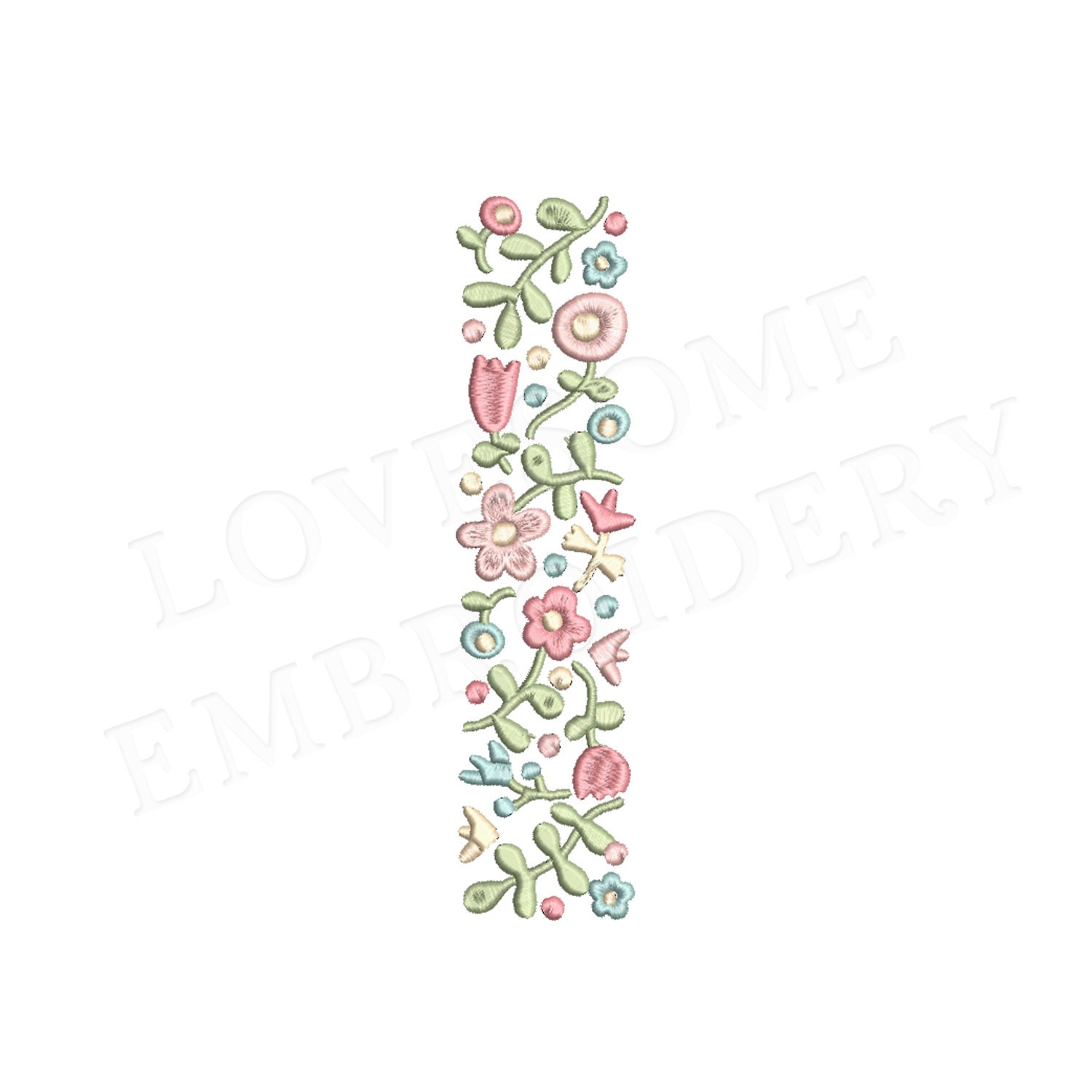 This listing features a machine embroidery file of one uppercase letter "I" which has a beautiful dainty floral fill design with pastel spring colors in 4inch size.