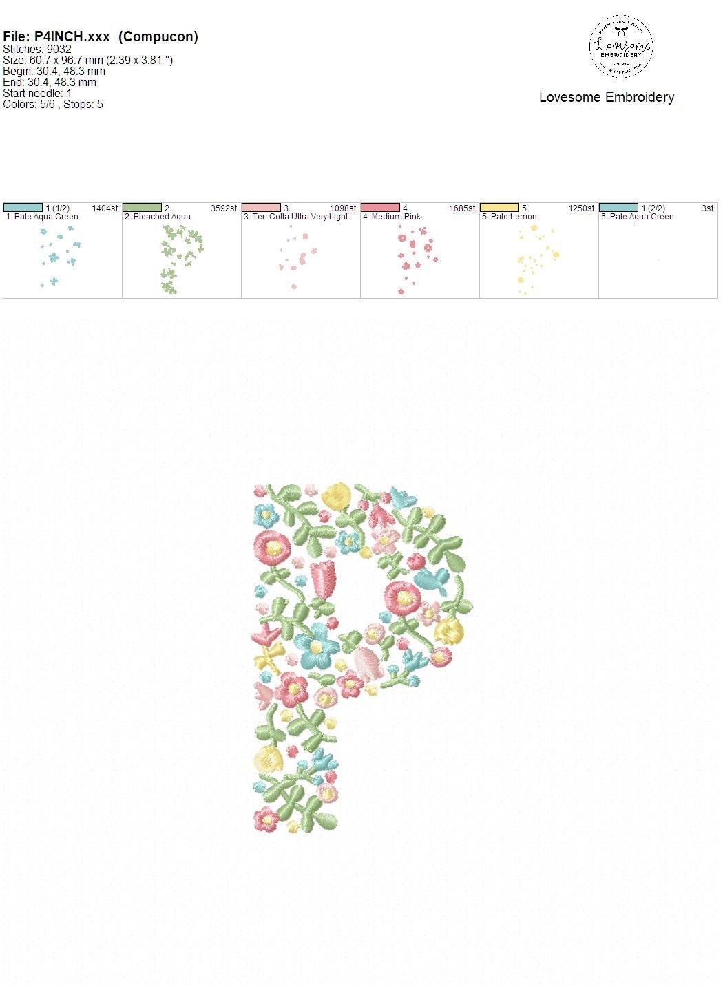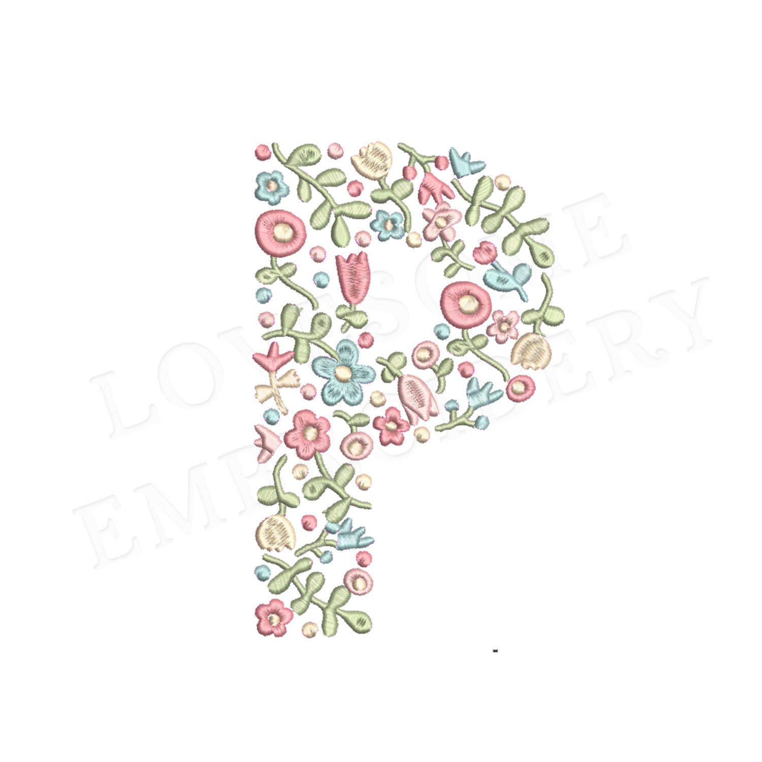 NEW Floral Letter P 4inch Machine Embroidery Design Dainty Flowers Letters in Spring Colors Digital Download | Lovesome Design