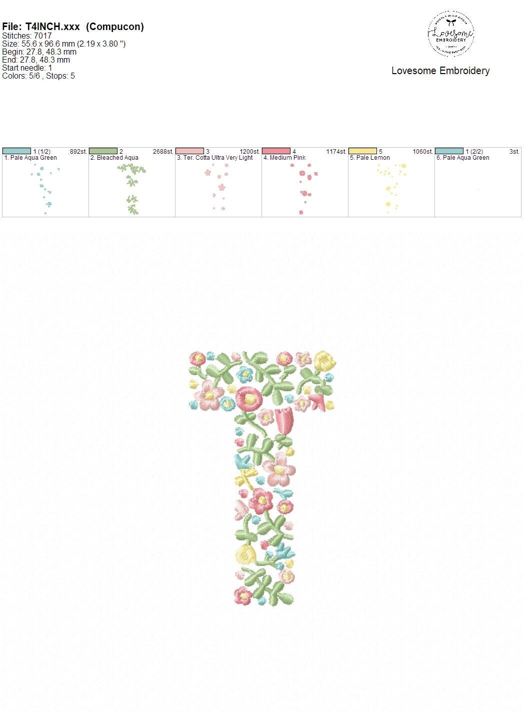 NEW Floral Letter T 4inch Machine Embroidery Design Dainty Flowers Letters in Spring Colors Digital Download | Lovesome Design