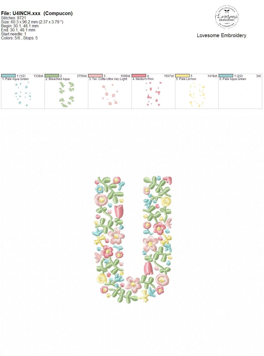 NEW Floral Letter U 4inch Machine Embroidery Design Dainty Flowers Letters in Spring Colors Digital Download | Lovesome Design