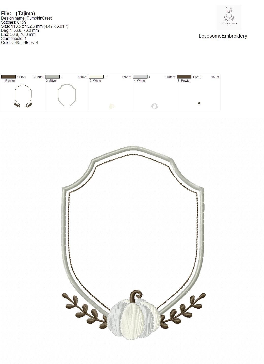 This listing features a machine embroidery file of a stylish pumpkin crest design in 6 inch size.