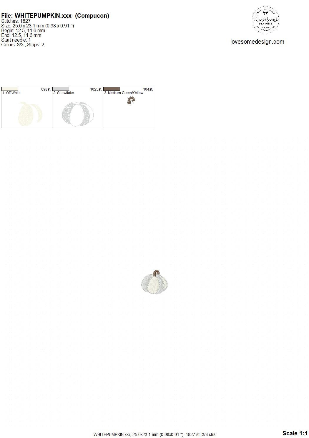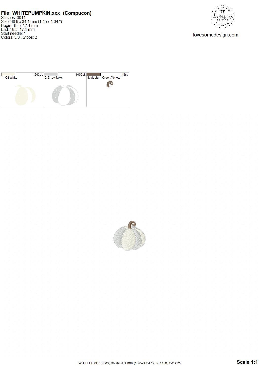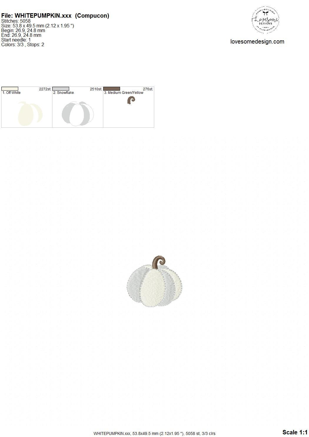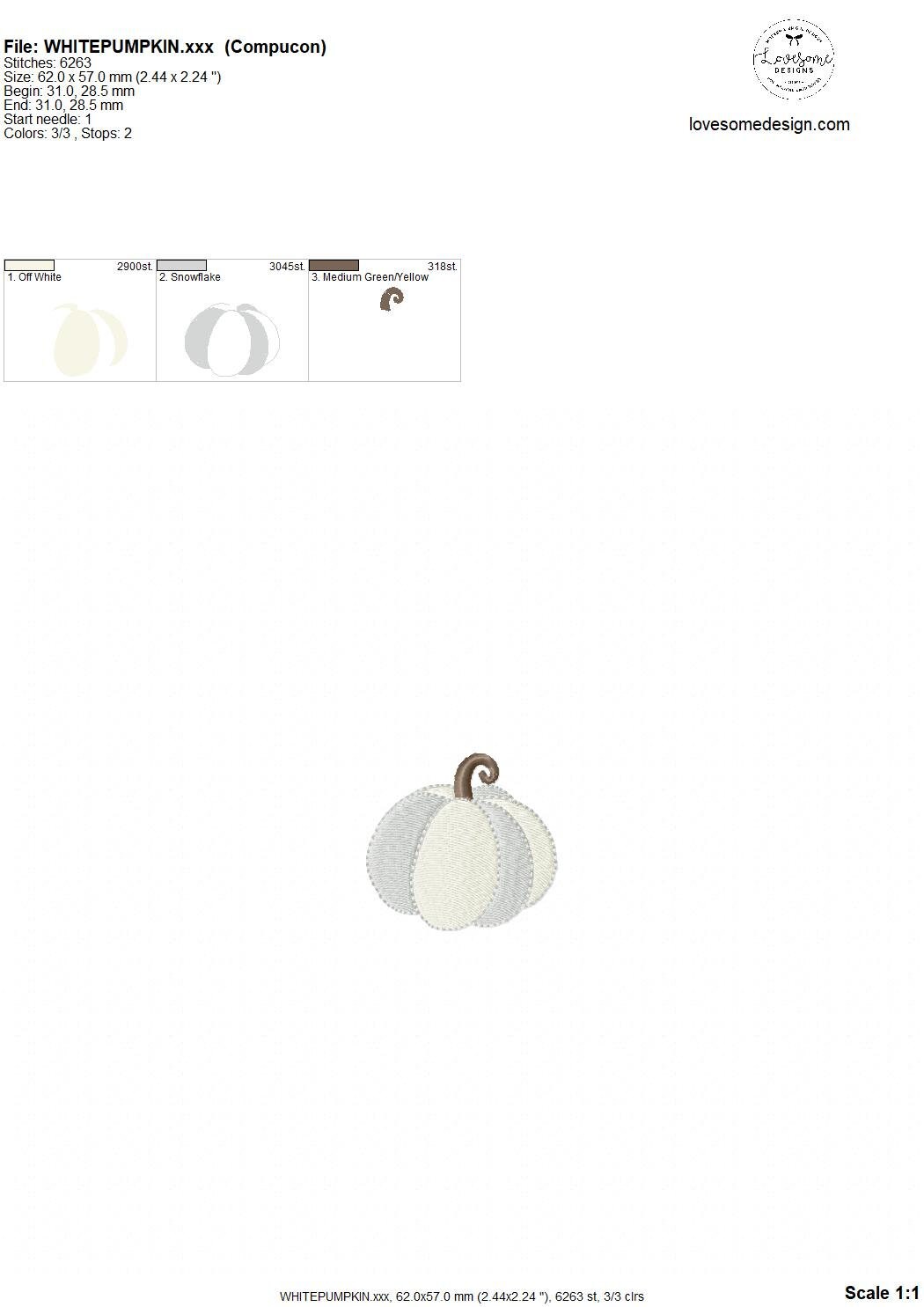 This listing features machine embroidery files of a stylish white pumpkin design in five sizes, including 3 inch, 2.5inch, 2inch, 1.5inch and 1inch size for embroidery hoop sizes 4x4 and bigger.