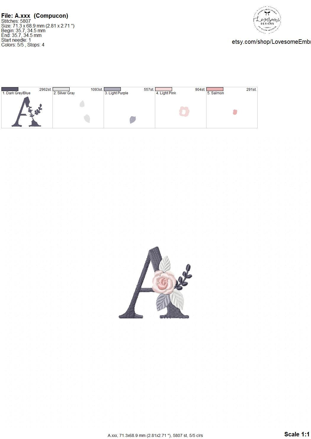 This listing features a machine embroidery font set which includes embroidery files of 26 uppercase floral letters in 3inch size. (For the whole set, pls see the listing images.)
