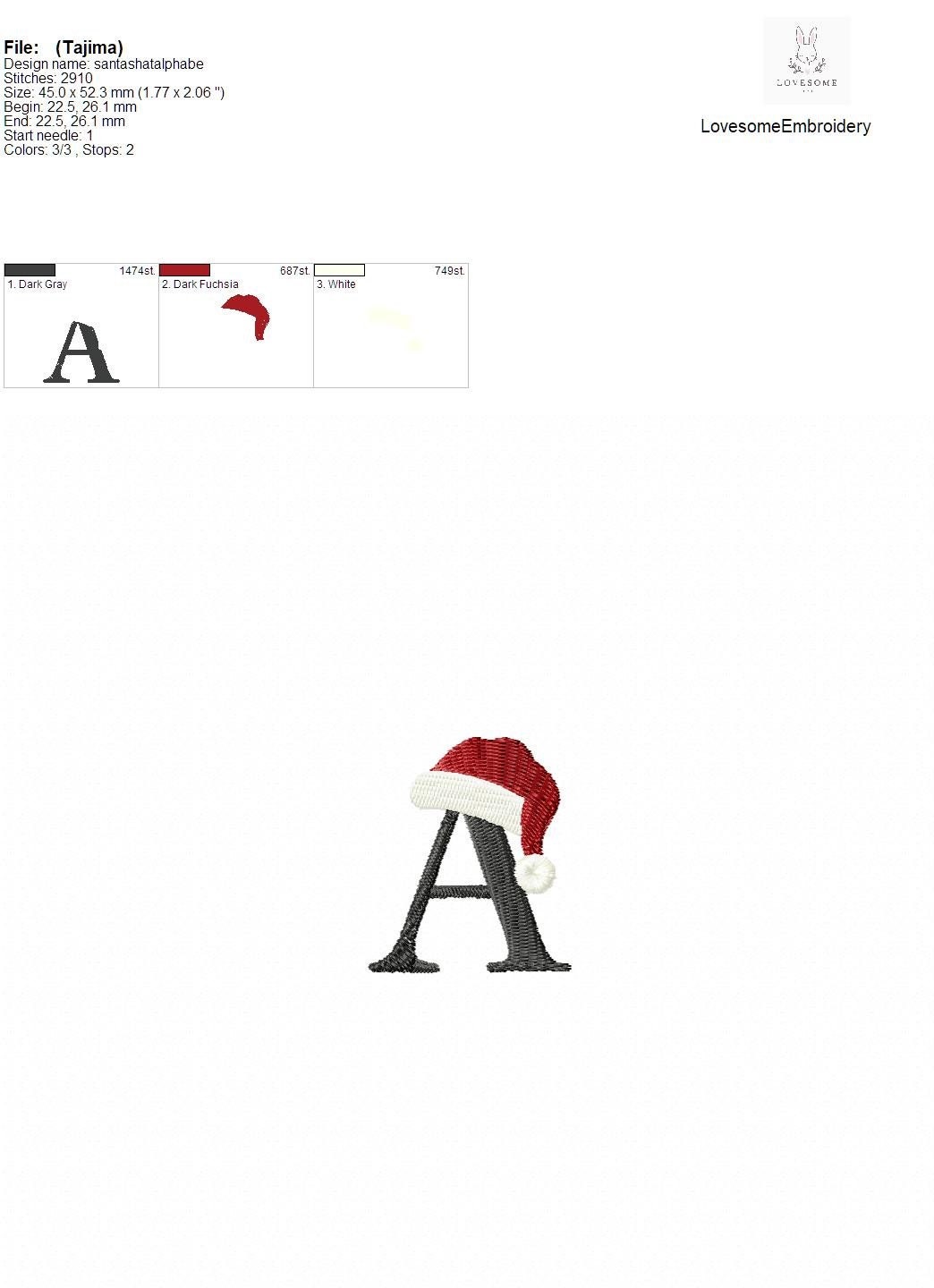 This listing features a machine embroidery font set which includes embroidery files of 26 uppercase letters with santas hat design in 2inch size. (For the whole set, pls see the listing images.)