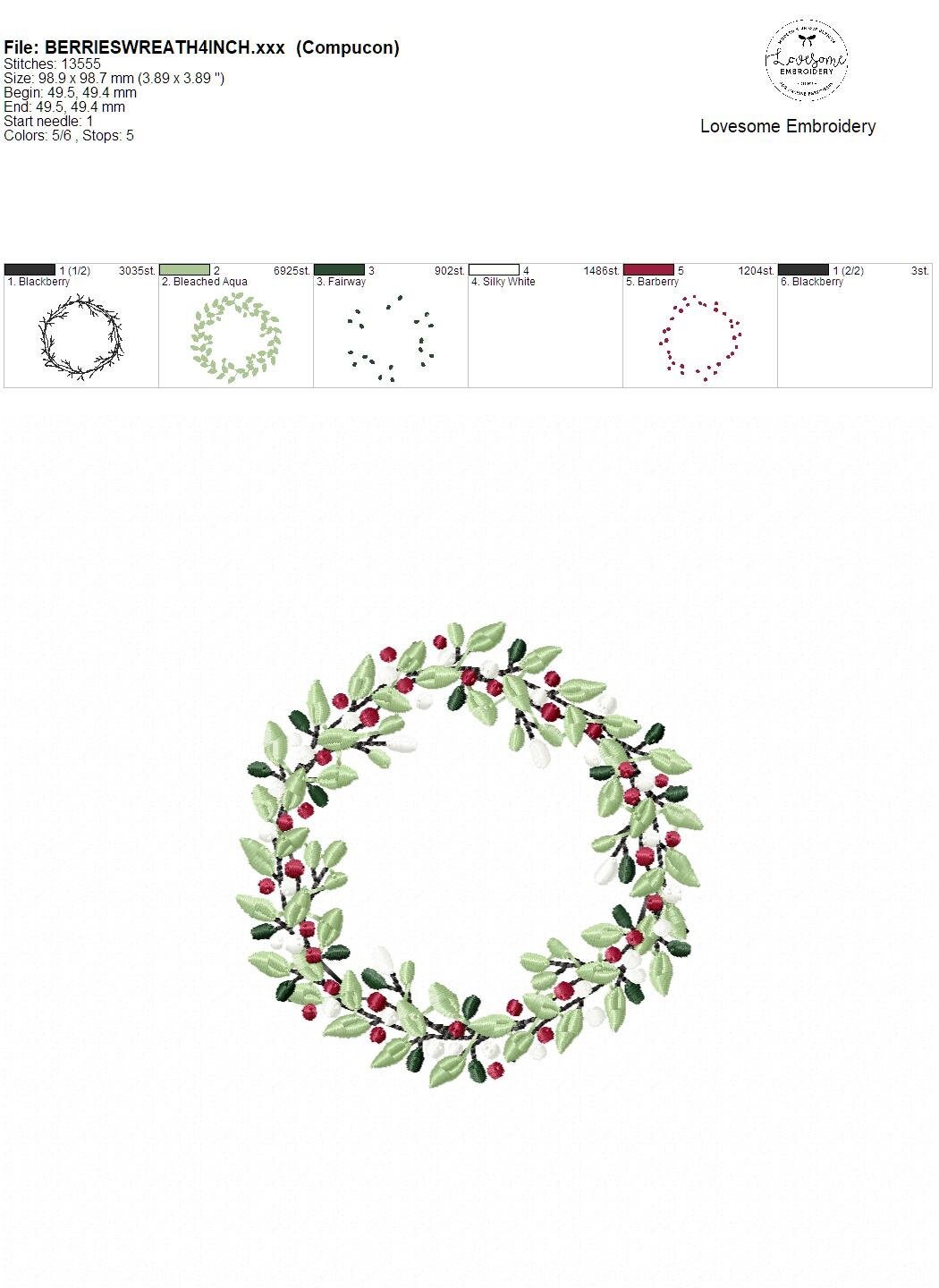 This listing features a machine embroidery file of berry wreath design in 4 inch size.