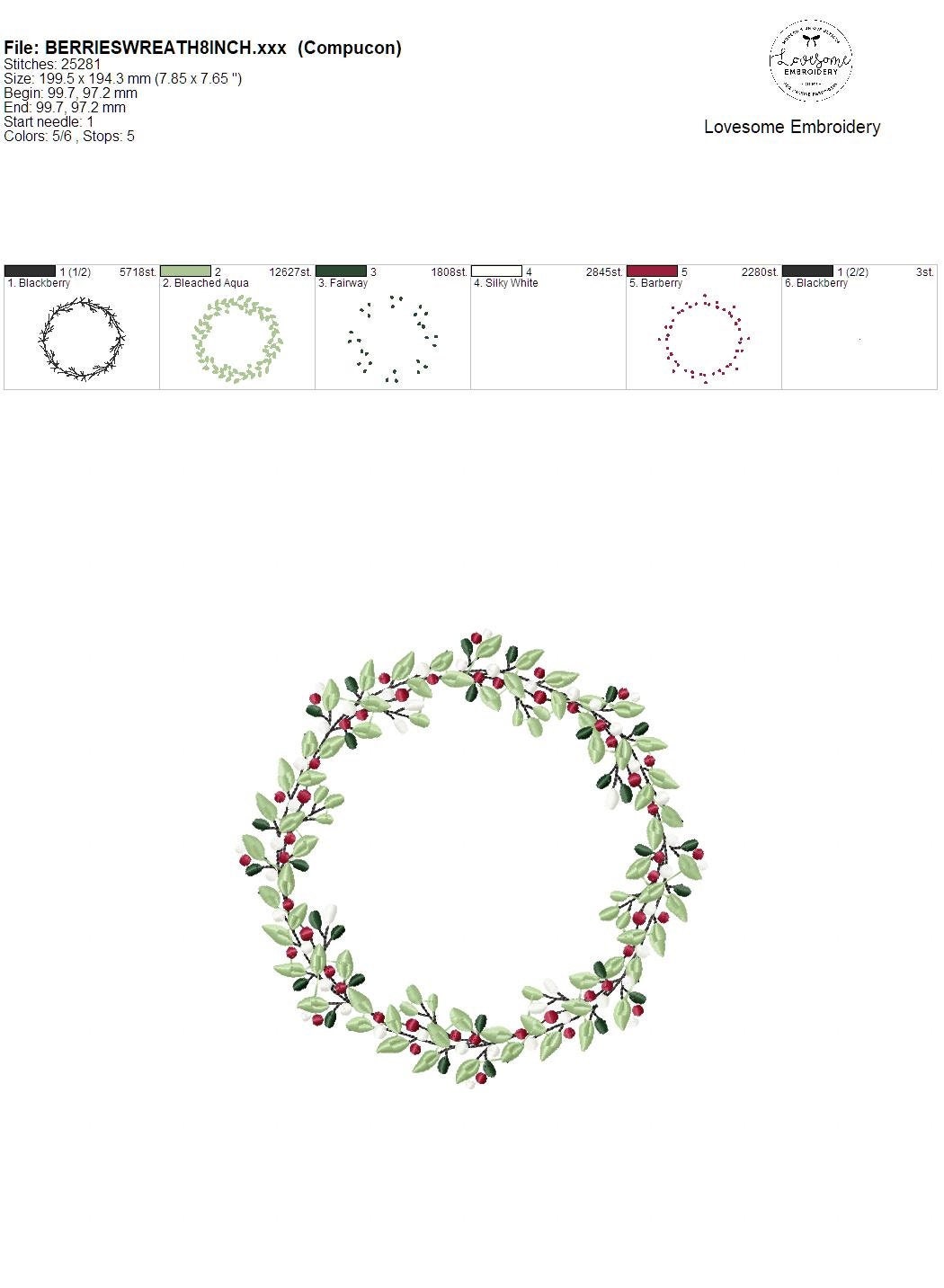 This listing features a machine embroidery file of berry wreath design in 8 inch size.