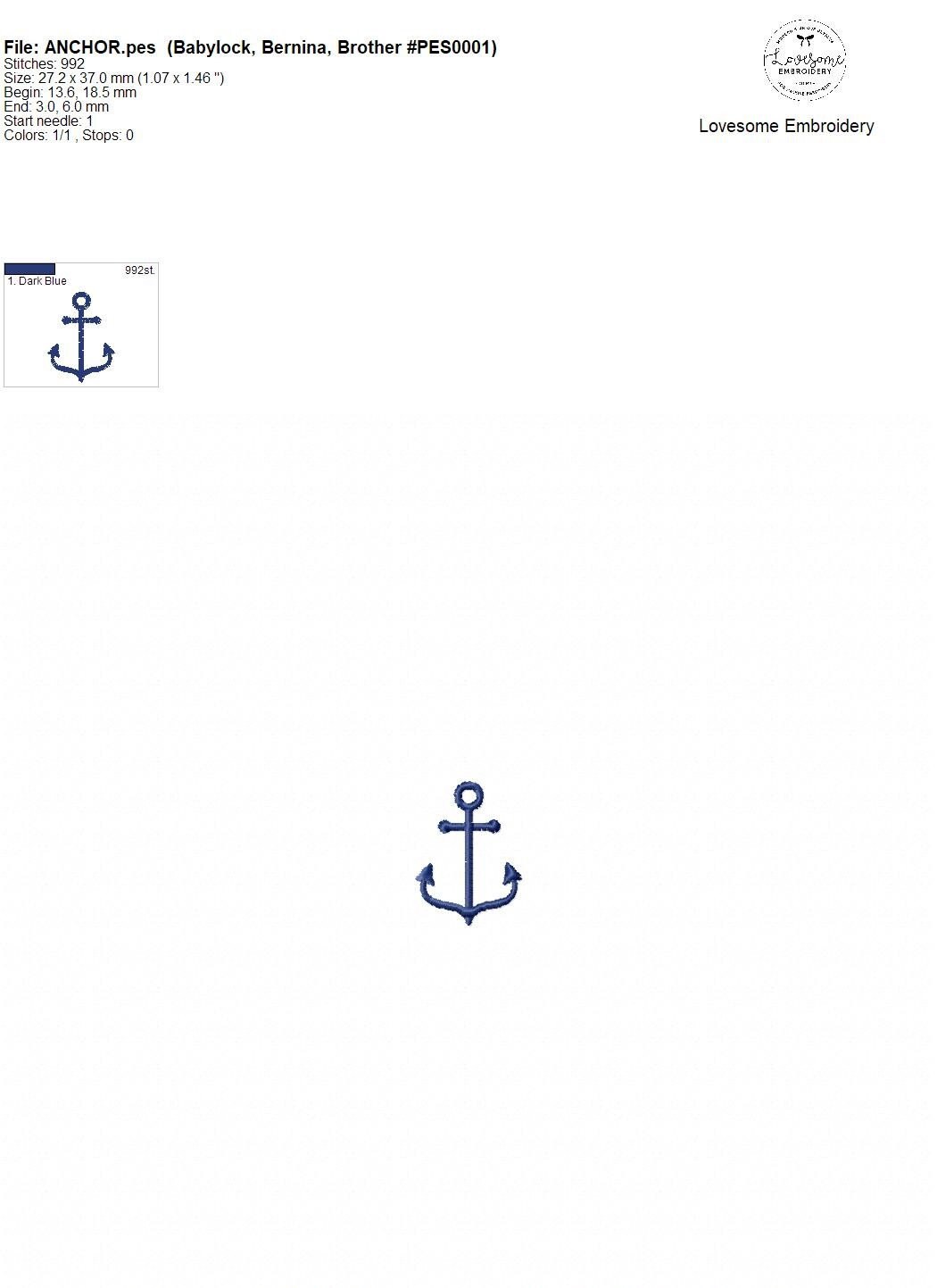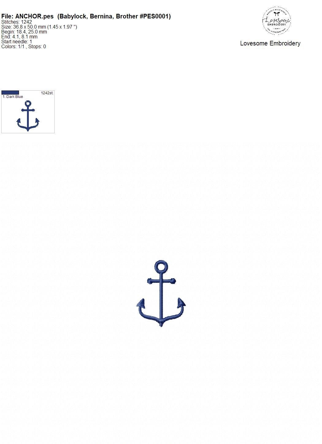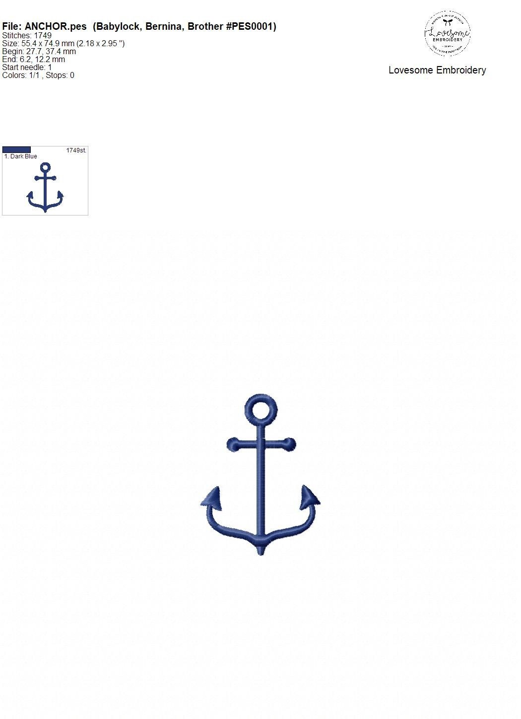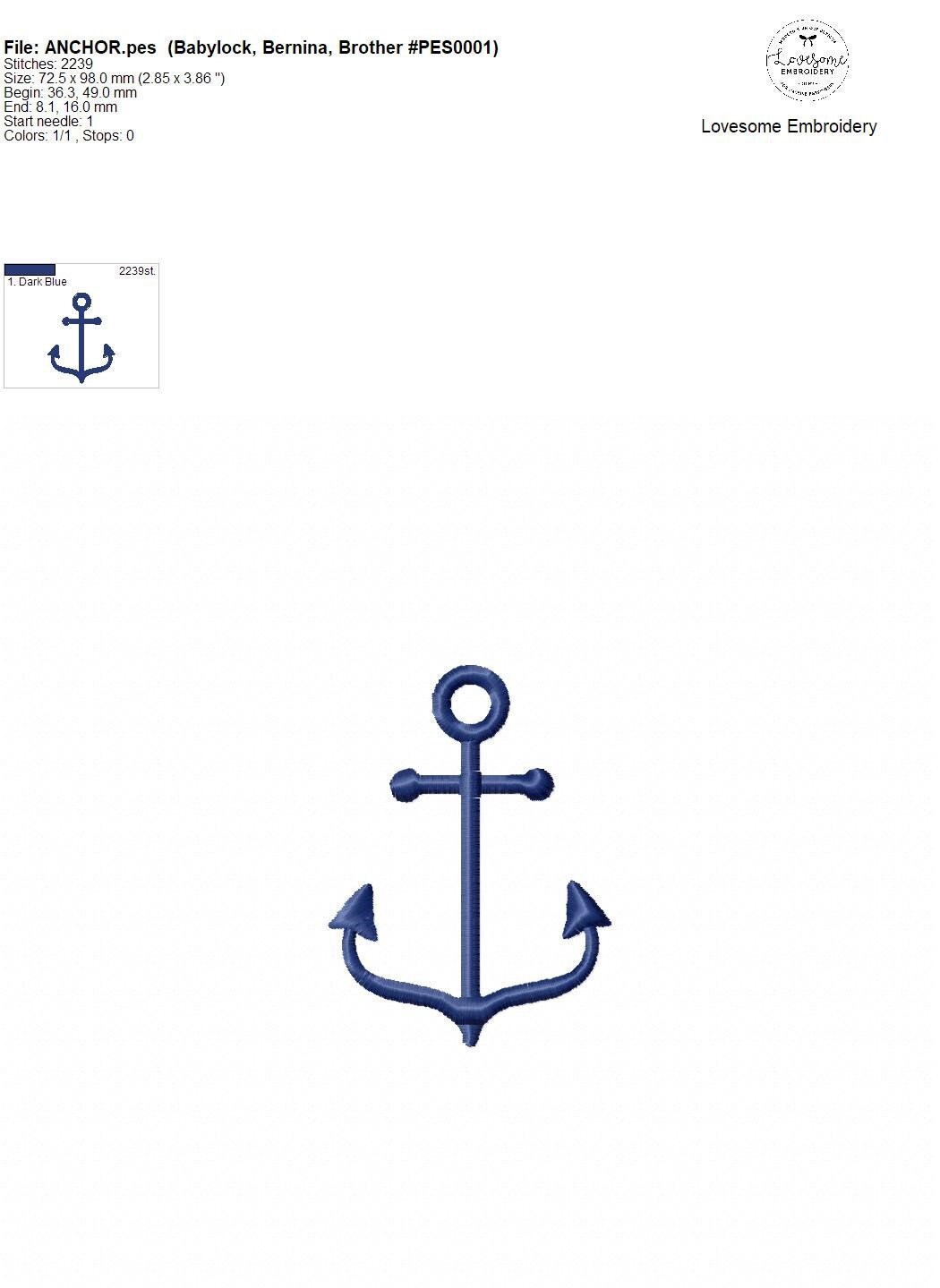 This listing includes one anchor design for machine embroidery in six sizes, each smaller than 1.5inch, 2inch, 2.5inch, 3inch, 3.5inch and 4inch for embroidery hoops 4x4 and bigger.