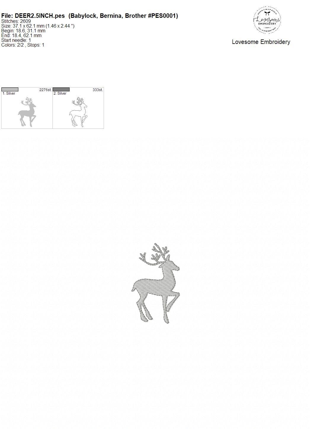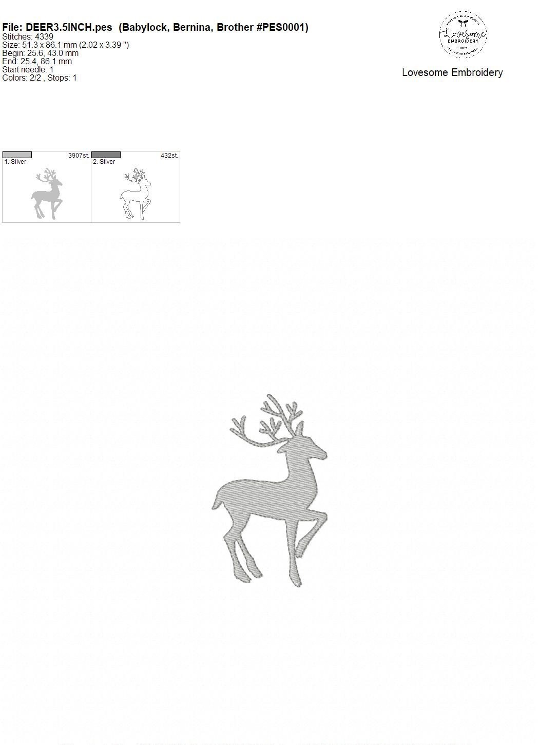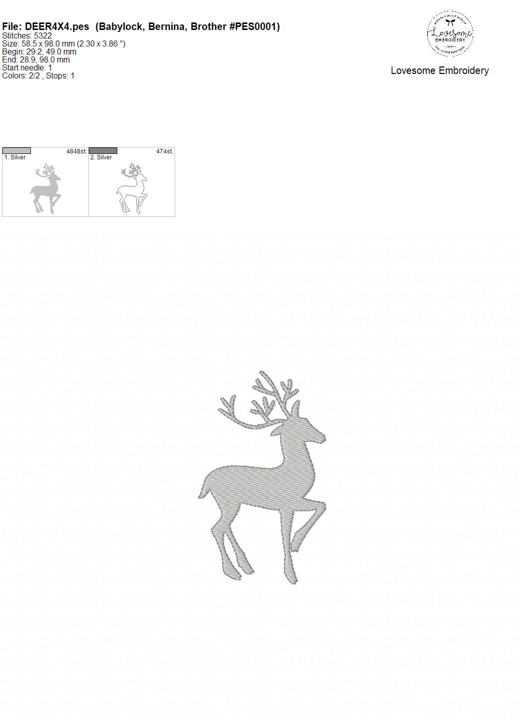 This listing includes one deer design for machine embroidery in four sizes, each appr. 2.5inch, 3inch, 3.5inch and 4inch size for embroidery hoops in different sizes.