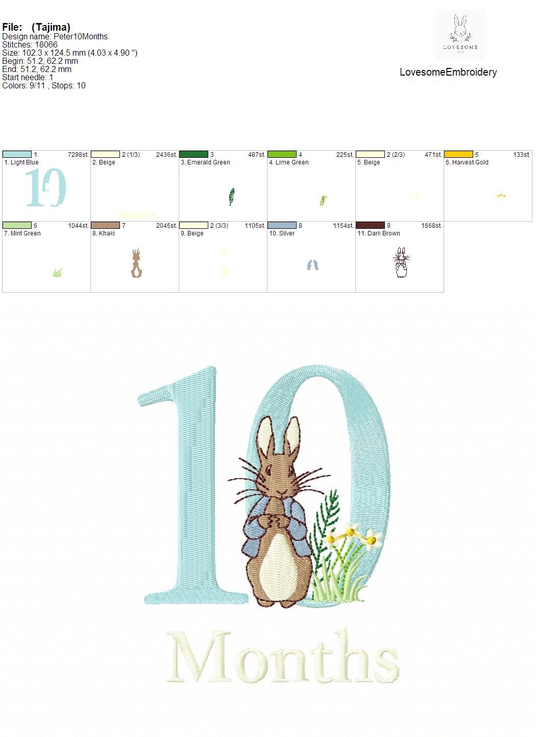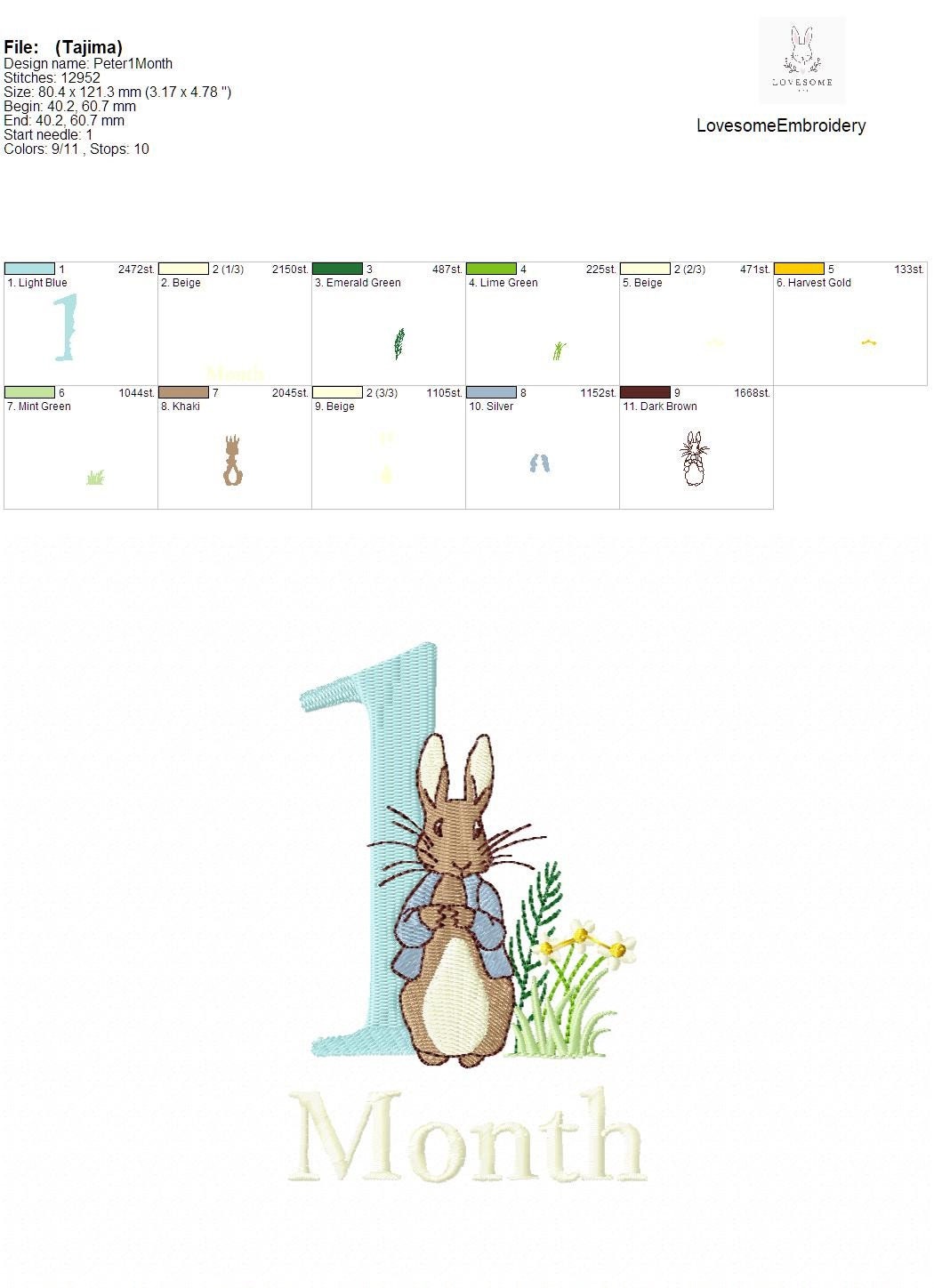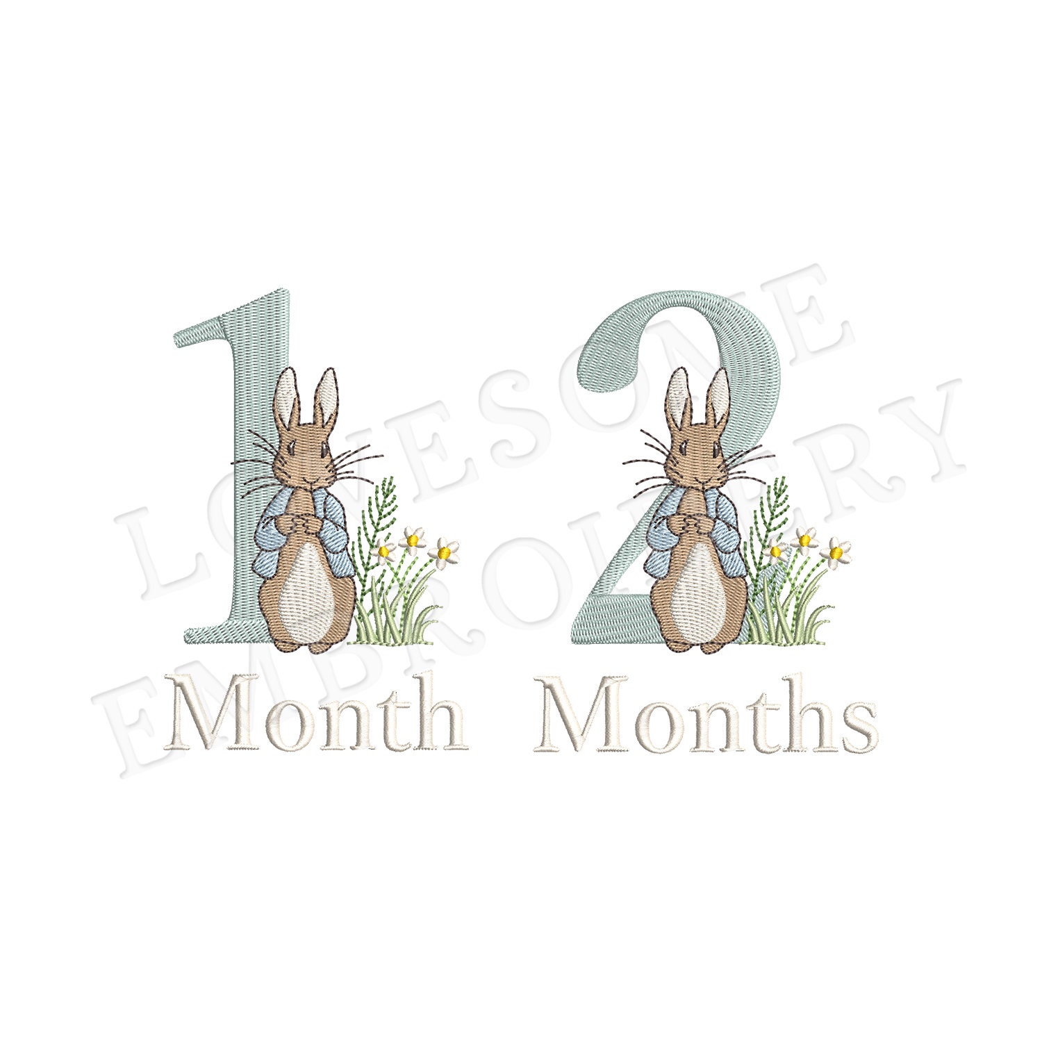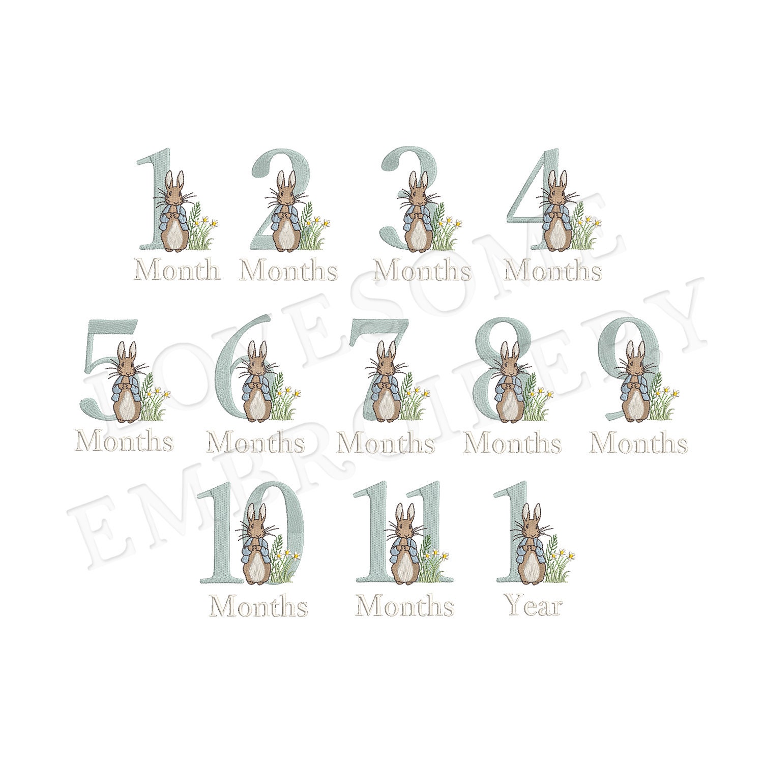This listing includes design set of Peter Rabbit from 1 Month to 1 Year, each in 5 inch size, can be stitched on 5x7 embroidery hoops. (For the whole set, pls see the listing images.)