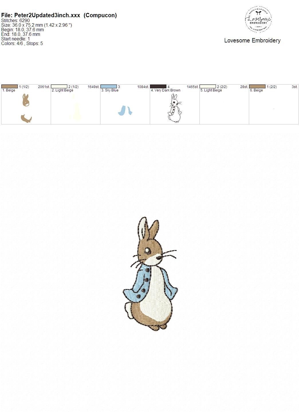 This listing features a machine embroidery file of Peter Rabbit design in 3 inch size.
