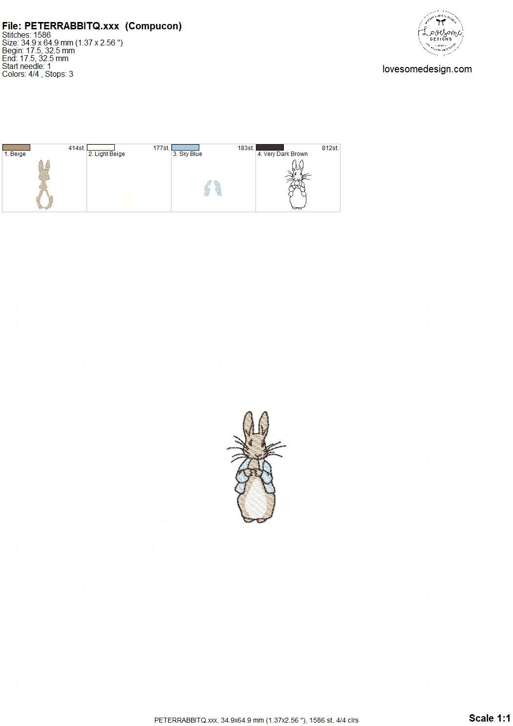 This listing features a machine embroidery file of a quick stitch (aka sketch fill or light fill) Peter Rabbit design in 2.5 inch size.