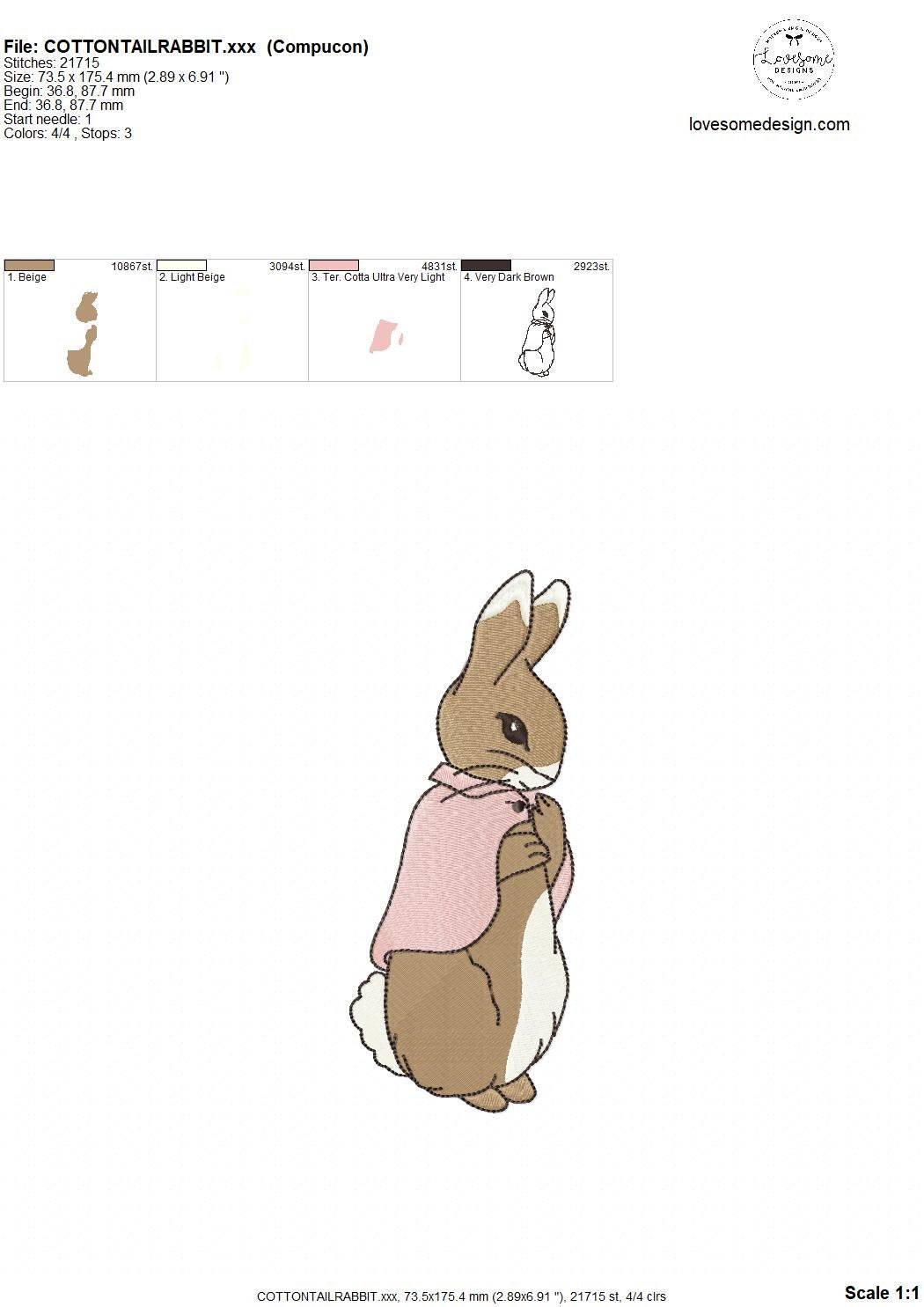 This listing features a machine embroidery file of Cottontail Rabbit design in 7 inch size.
