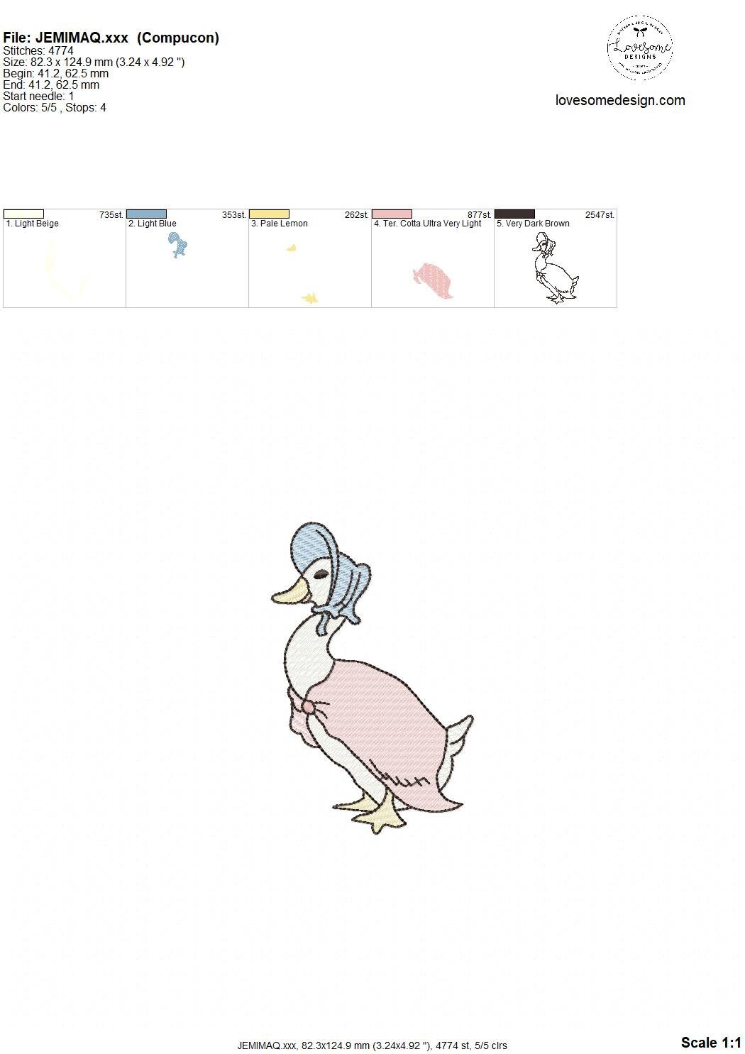 This listing features a machine embroidery file of a quick stitch (aka sketch fill or light fill) Jemima Puddleduck design in 5 inch size.