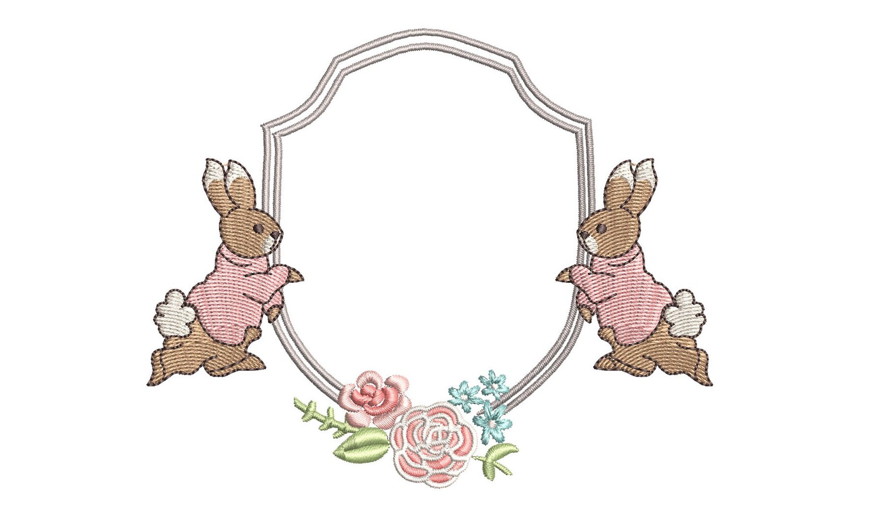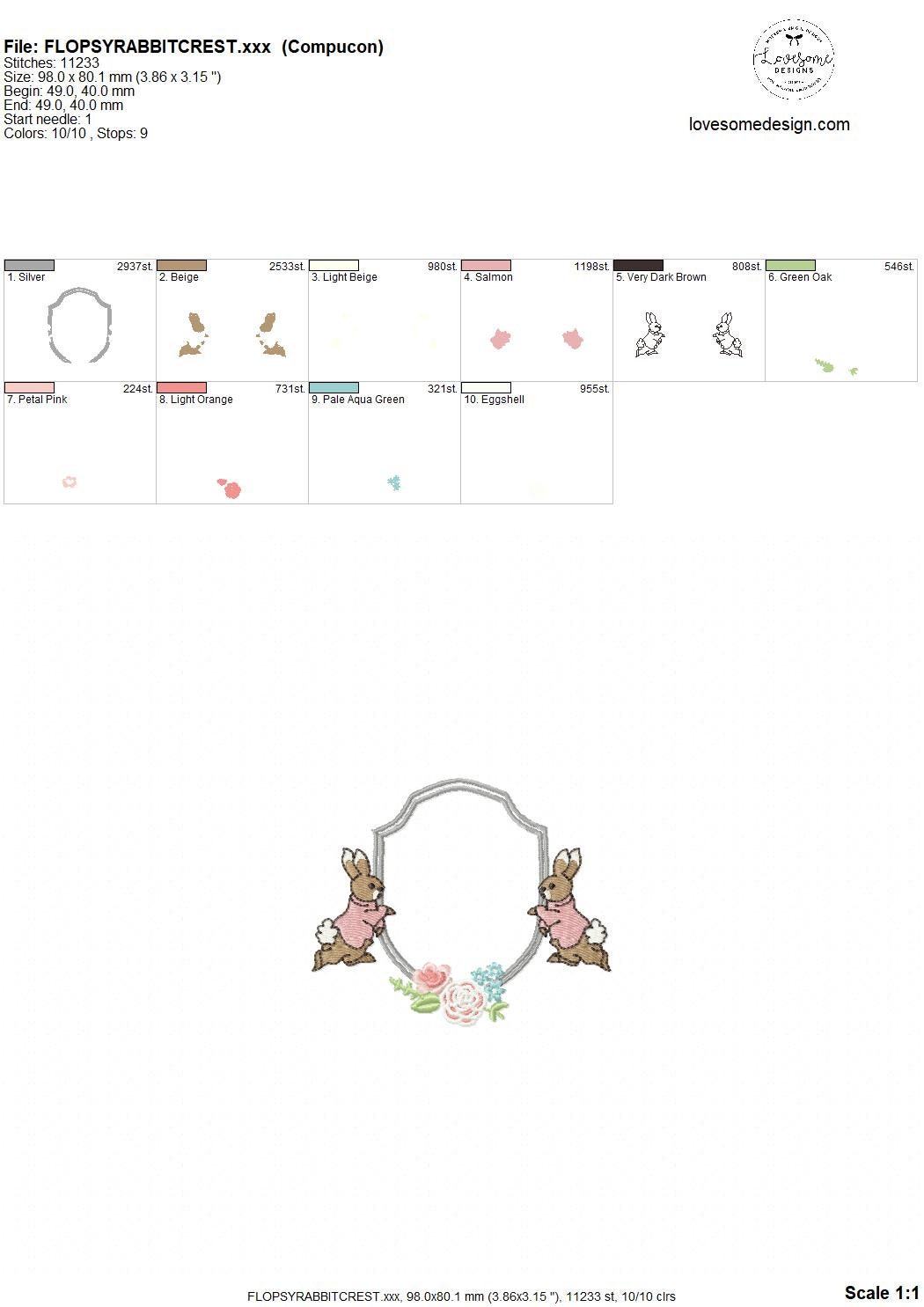 This listing features a machine embroidery file of floral Flopsy Rabbit crest design in 4 inch size.